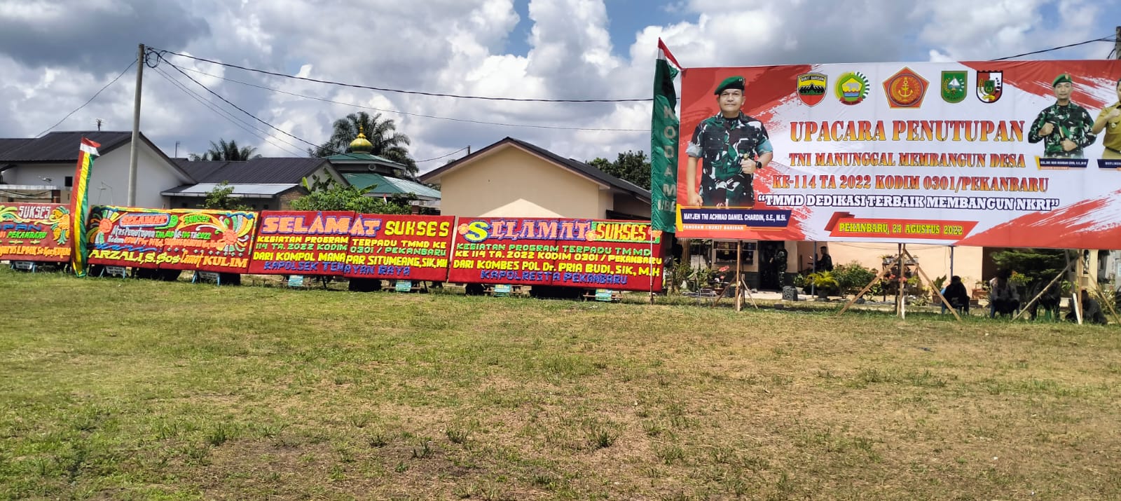 Penutupan TNI Manunggal Membangun Desa (TMMD) ke 114 Kodim 0301/PBR dibanjiri papan bunga ucapan selamat dan sukses yang sudah terpajang di lapangan Perum Griya Teratai Indah, Kelurahan Sialang Rampai, Kecamatan Kulim, Kota Pekanbaru, Rabu.
