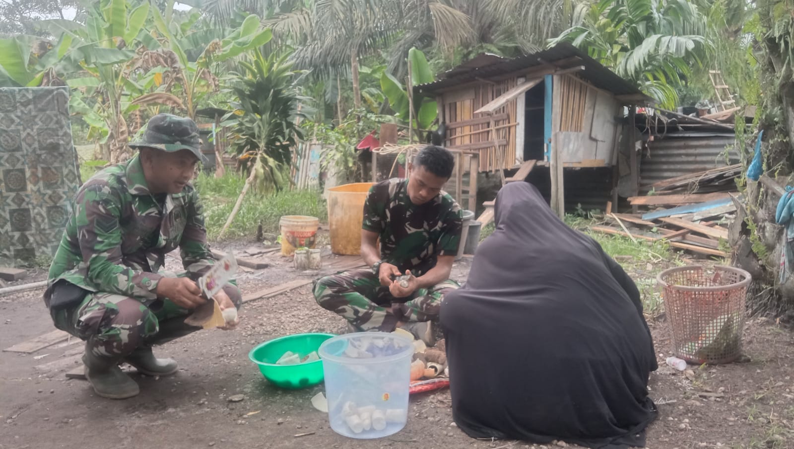 Disela-sela melakukan tugas pengerjaan sasaran fisik TMMD, Sertu Wiyono dan Prada Febriadi, Anggota Satgas TMMD ke 114 Kodim 0301/Pekanbaru, masih menyempatkan diri untuk membantu warga mengupas dan membersihkan ubi hasil panen di.