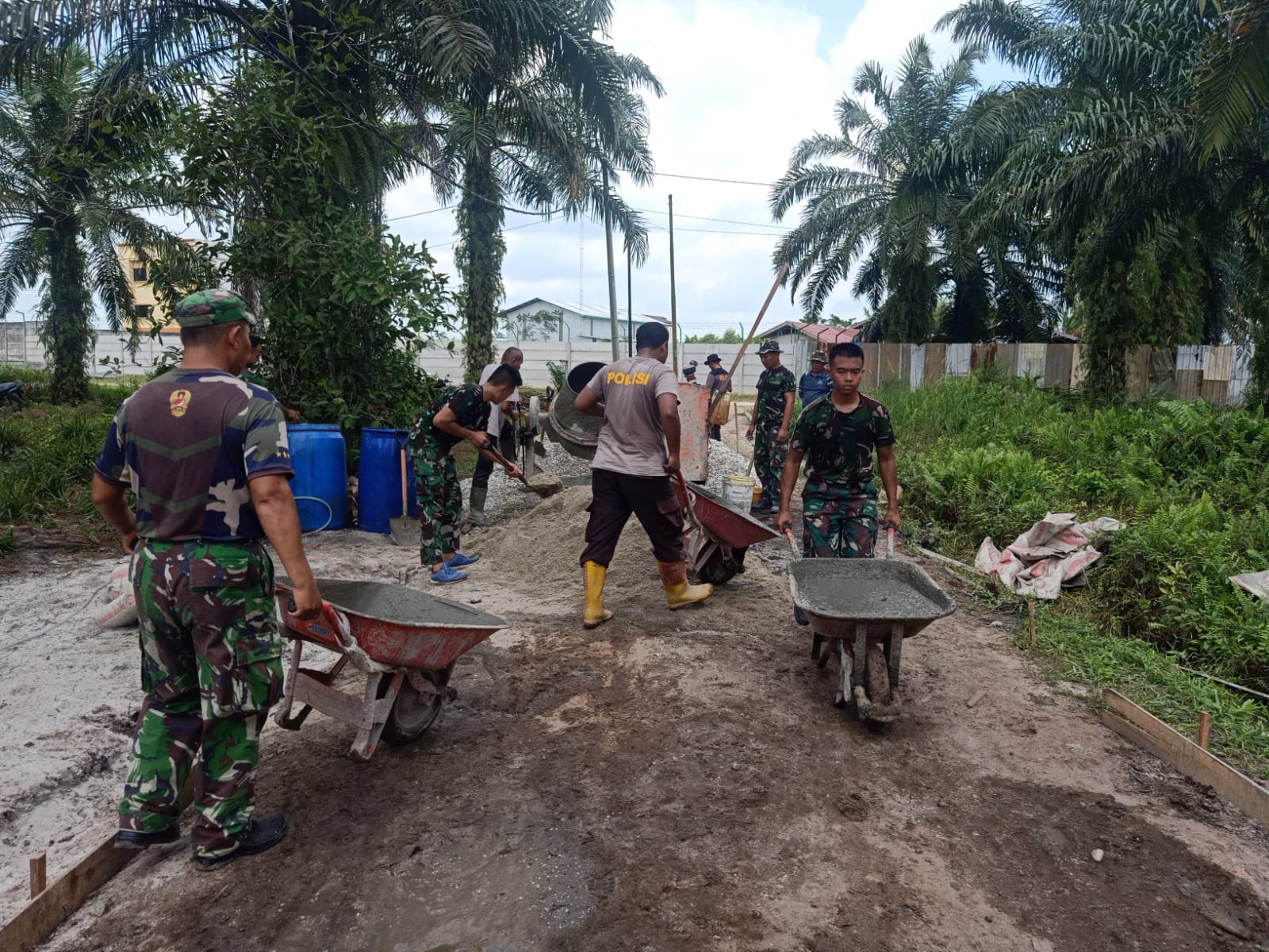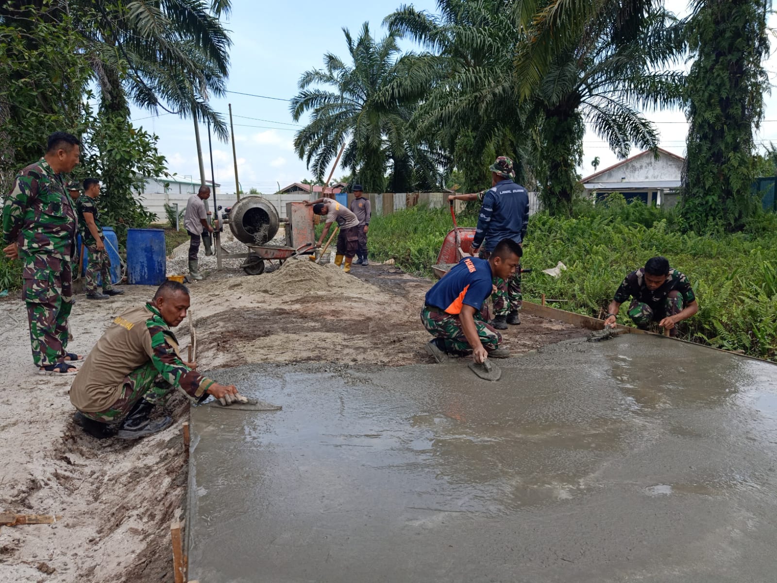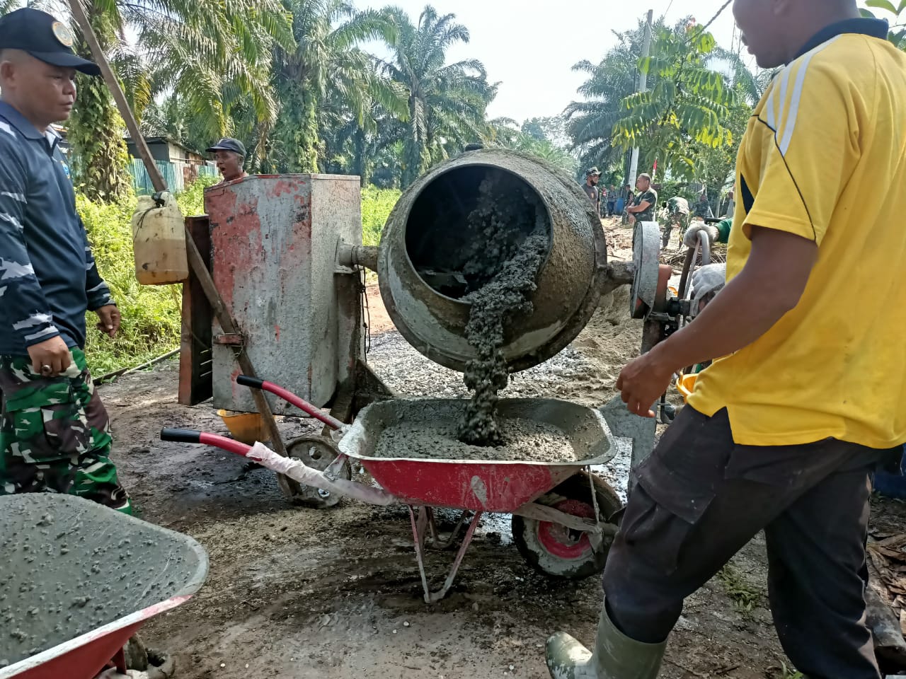 Semangat gotong royong, Satuan Tugas TMMD Reguler ke-114 Kodim 0301/Pekanbaru bersama masyarakat melaksanakan pekerjaan program fisik pengerjaan pengecoran semenisasi Jalan Bunga Tombak Kelurahan Sialang Rampai Kecamatan Kulim Kota Pekanbaru, Kamis.