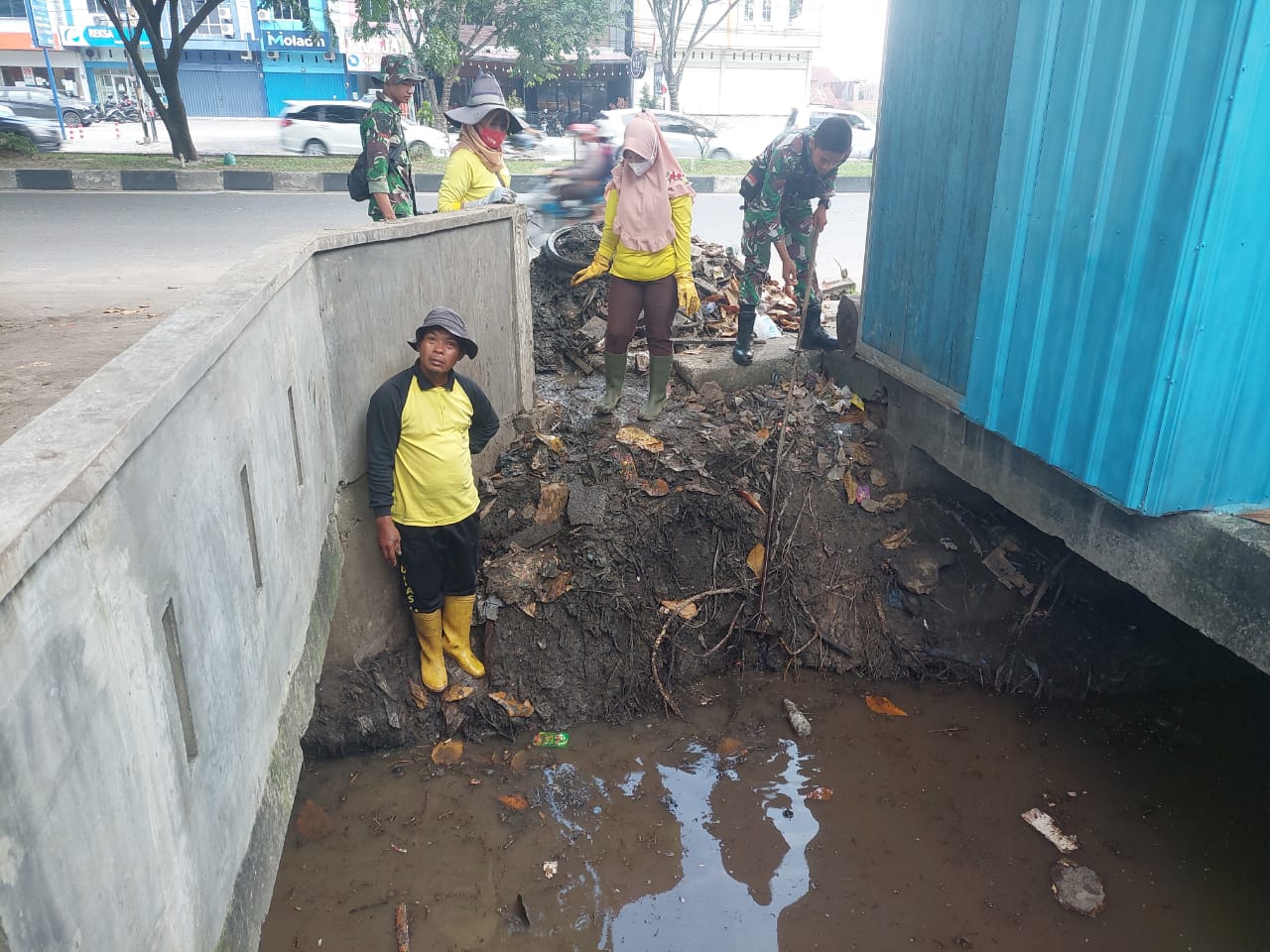 Tiada mengenal lelah dan semangat demi mewujudkan Kota Pekanbaru yang bersih dan bebas banjir, Satuan tugas (Satgas) TMMD ke 114 Kodim 0301/PBR bersama pasukan kuning dinas PUPR kembali turun membersihkan drainase di Jalan Arifin Ahmad, Kecamatan.