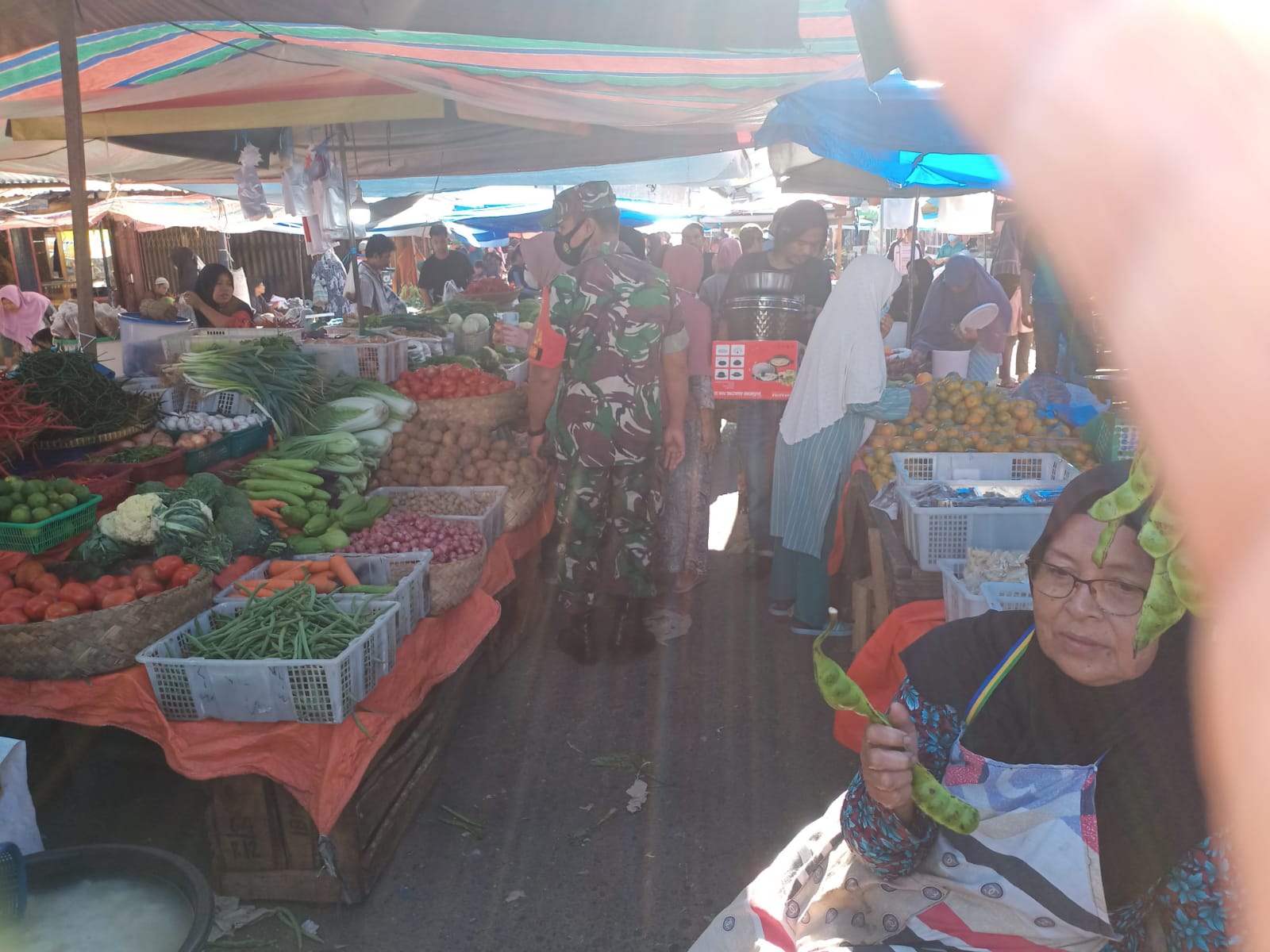 Sertu Parjo melaksanakan patroli dan sosialisasi Protkes ini dengan menyisir beberapa area pedagang dan pengunjung yang ada di Pasar tradisional yang berada ditengah.