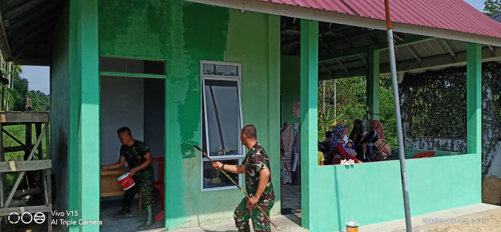 Anggota satgas TMMD ke-114 Kodim 0301/PBR bergotong royong membersihkan dan mengecat dinding luar dalam warna hijau Posko TMMD di jalan Kemuning Kelurahan Sialang Rampai Kecamatan Kulim, kota Pekanbaru, Selasa (9/8/2022). Kegiatan pengecatan ini.