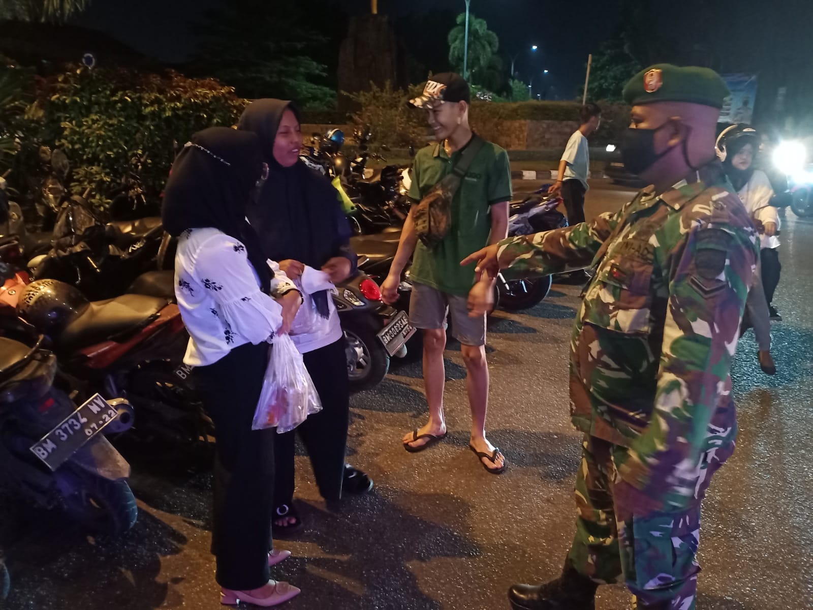 Serda Arman, Babinsa Koramil 06/Sukajadi Kodim 0301/PBR bersama personel Brimob melaksanakan patroli gabungan dalam rangka sinergitas TNI-Polri dan penegakan Protokol kesehatan Covid-19 di wilayah Kota Pekanbaru, Minggu malam (3/7/2022) pukul 20.00.