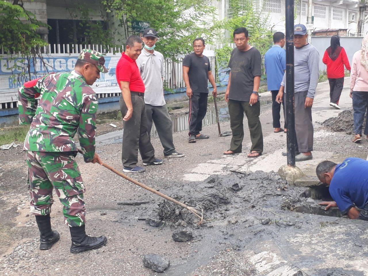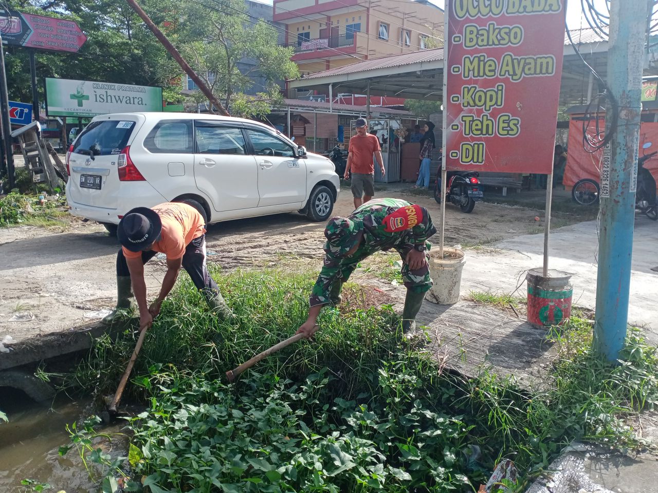 Babinsa koramil 06/Sukajadi Kodim 0301/PBR, Serka Adeng melaksanakan gotong royong bersama warga binaan Jalan KH Ahmad Dahlan RT 02 RW 08 Kelurahan Kampung Melayu Kecamatan Sukajadi, Minggu.