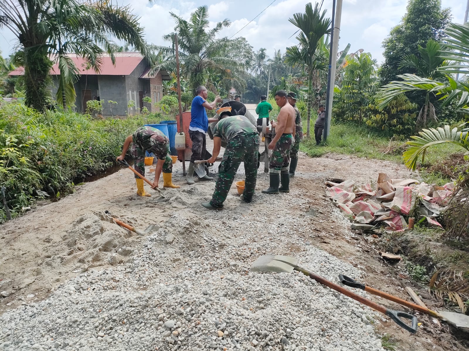 Cuaca panas matahari menyengat di hari Sabtu (6/8/22), tidak mematahkan semangat anggota Satgas TNI Manunggal Membangun Desa (TMMD) ke 114 Kodim 0301/PBR terus mengangkut material kerikil dengan menggunakan gerobak mini besi roda satu ke lokasi.