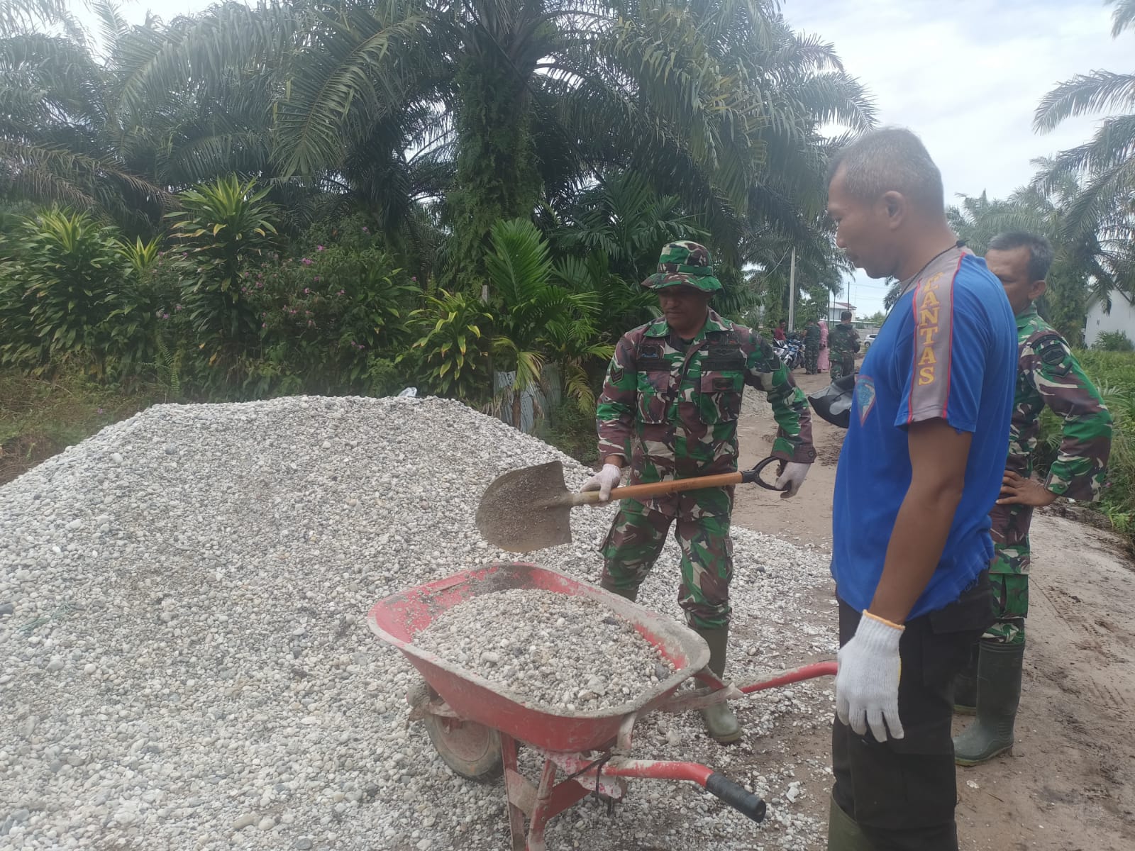 Babinsa Koramil 06/Sukajadi, Serka Adeng yang tergabung di Satuan tugas TNI Manunggal Membangun Desa (TMMD) ke 114 Kodim 0301/PBR ikut membantu mengangkut bahan material kerikil dengan menggunakan gerobak roda satu ke mesin molen yang.