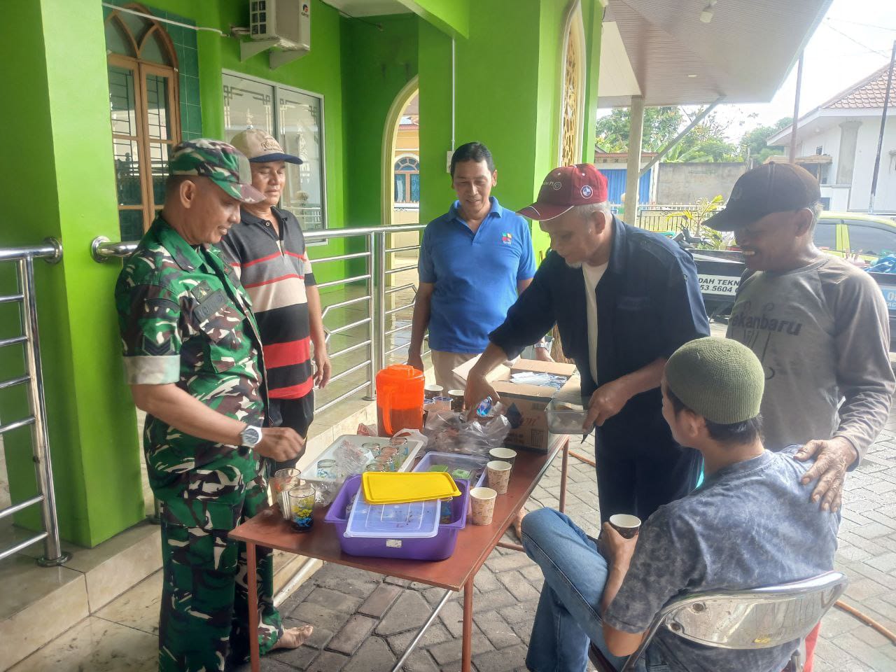 Suasana Kebersamaan Usai Gotong Royong, Babinsa Serka Noviandi dan Warga Santap Siang di Halaman Masjid Jalan.