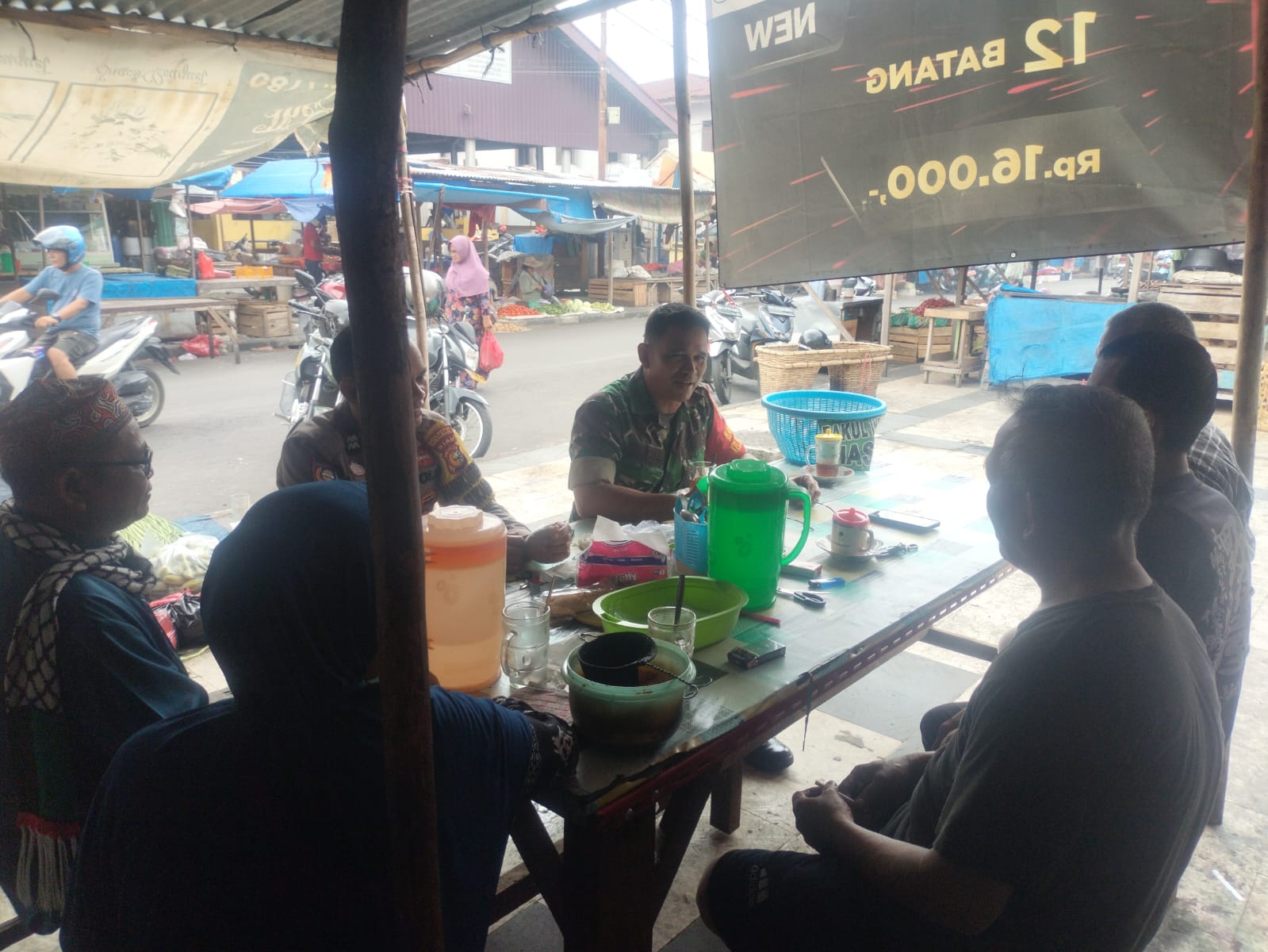 Sambil Sarapan Pagi, Babinsa Sertu Robert Sitorus Ajak Pedagang dan Warga Jaga Kebersihan Pasar Agus.
