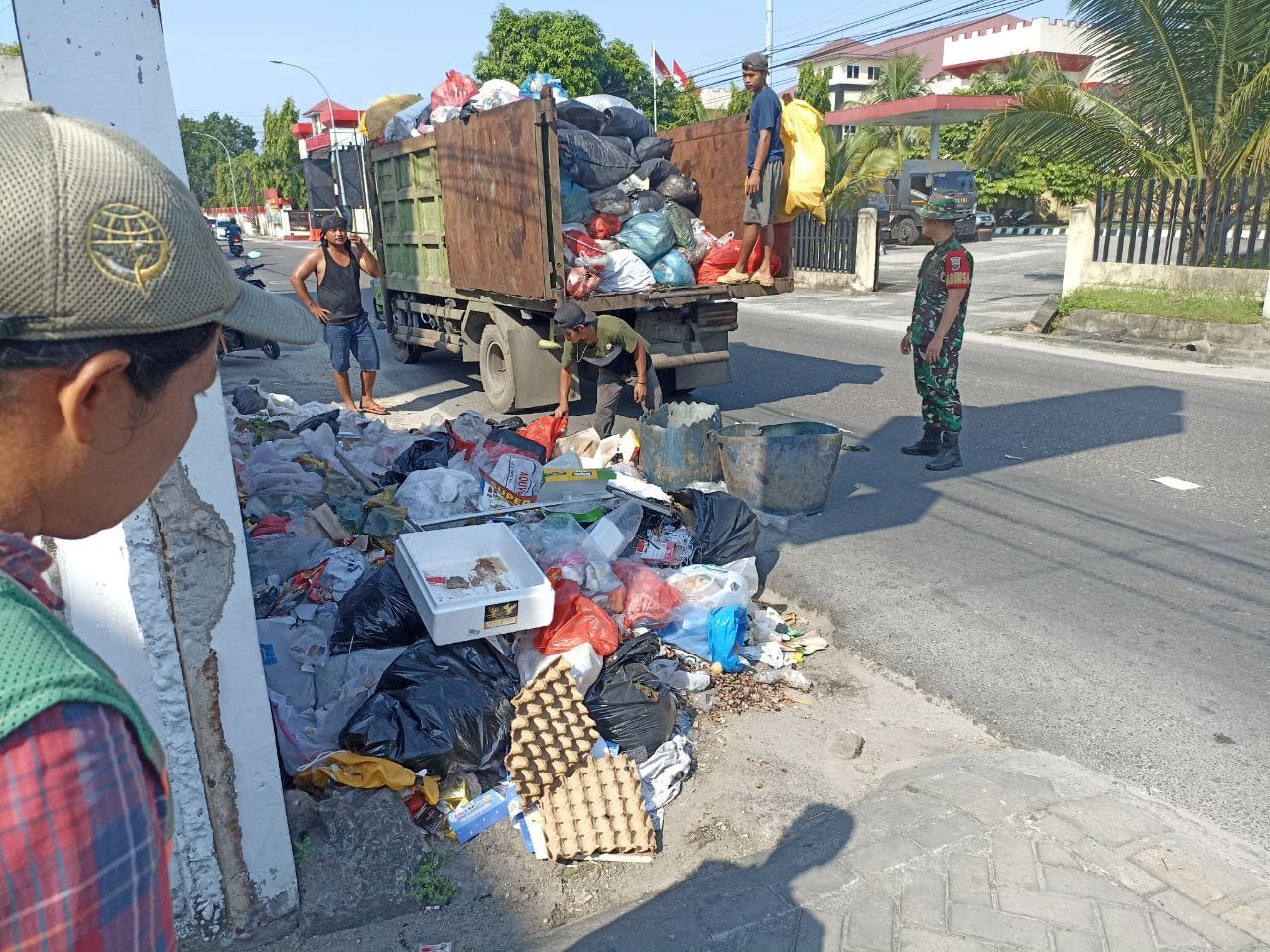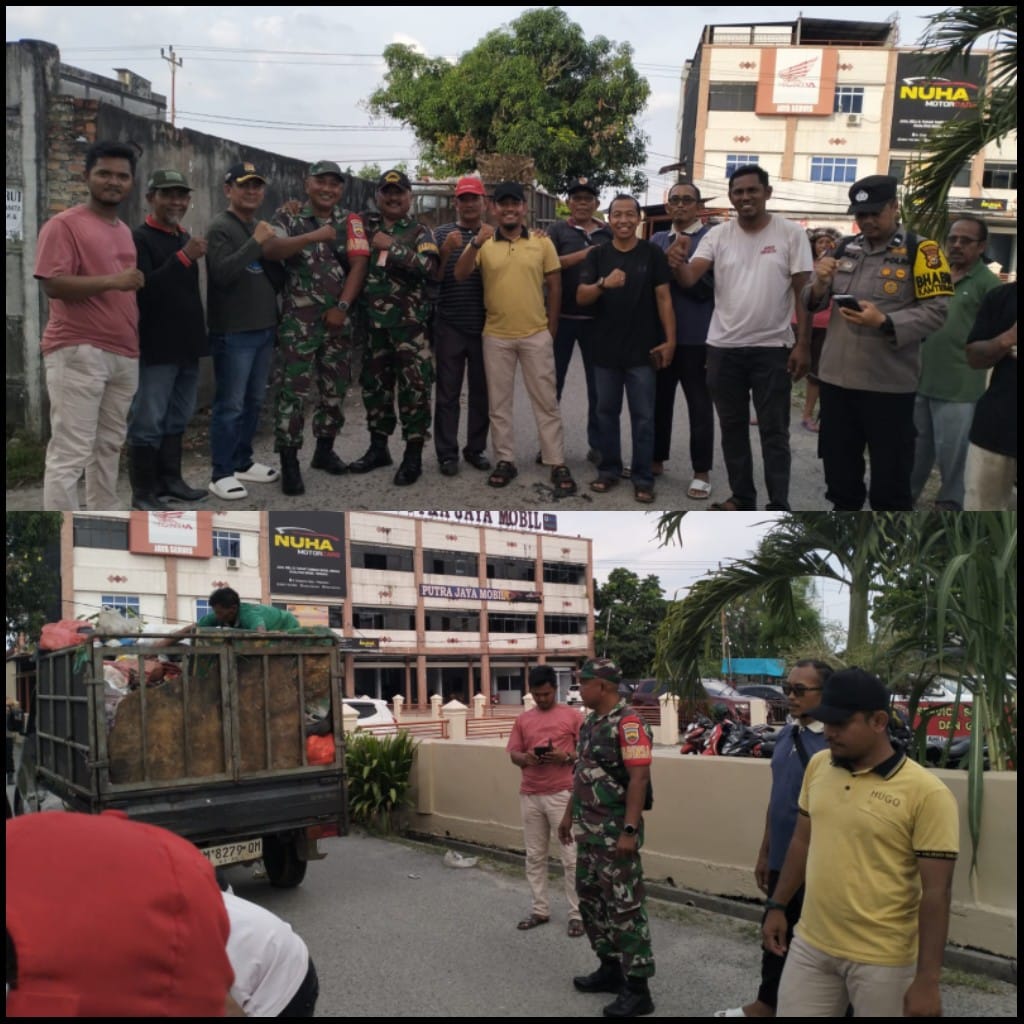 Babinsa Sertu Sutan Siregar Kawal Pembersihan Sampah di Jalan KH. Dahlan.