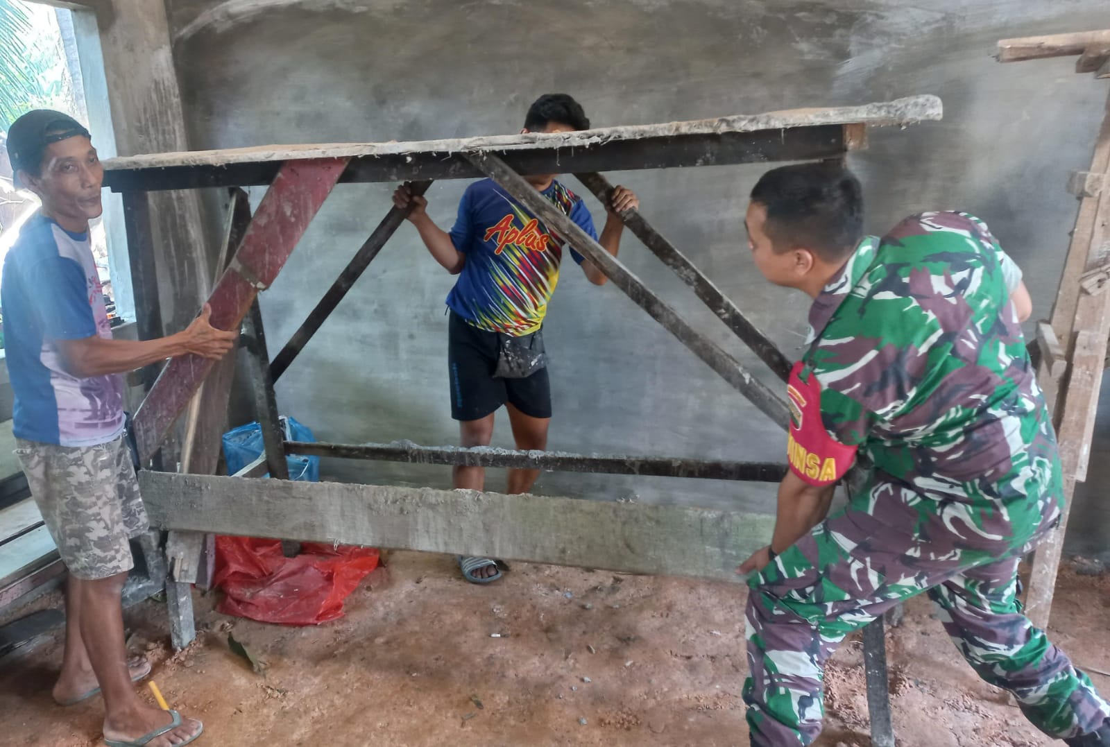 Singsingkan Lengan Baju, Babinsa Serda Feri Gotong Royong Bangun Rumah.
