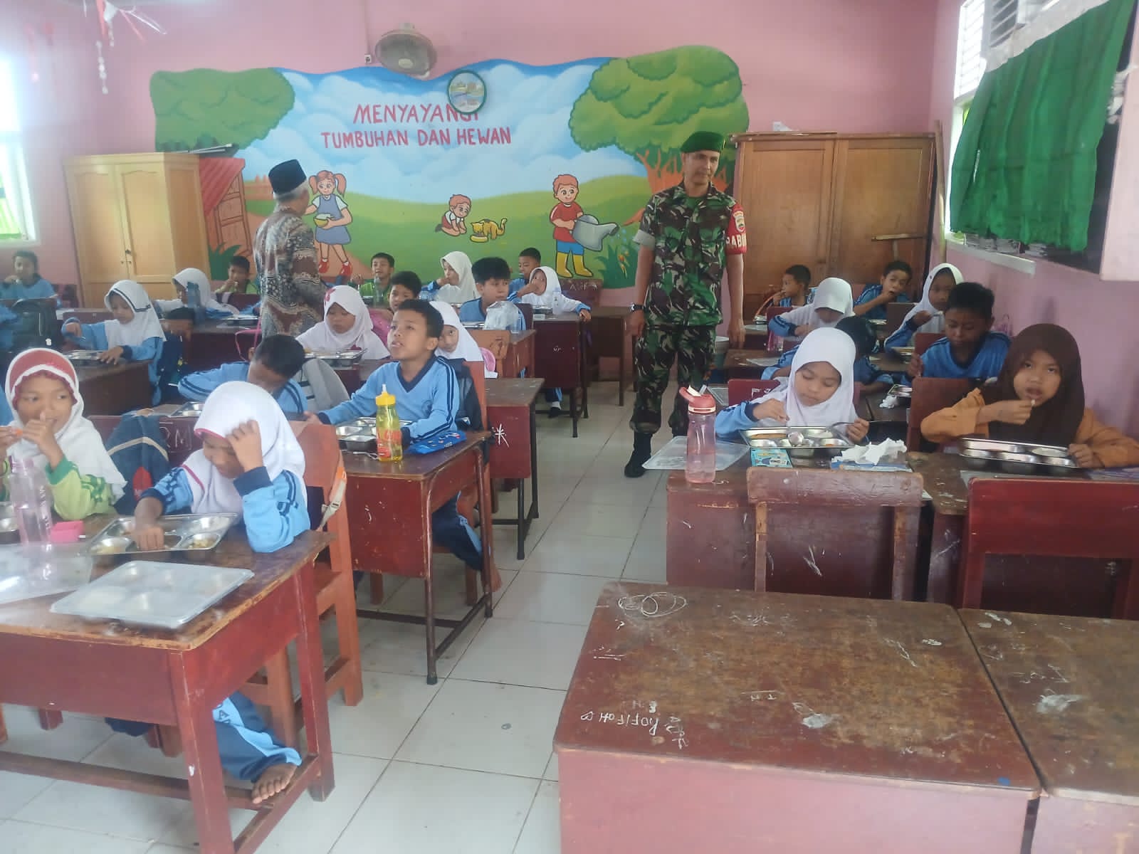 Babinsa Serka Noviandi Pendampingan Pembagian Makan Sehat Bergizi Kepada Siswa SDN.