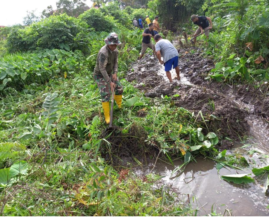 Babinsa Kodim 0301/Pbr Gotong Royong Bersihkan Aliran Air Tersumbat Mengakibatkan Pemukiman Warga,.