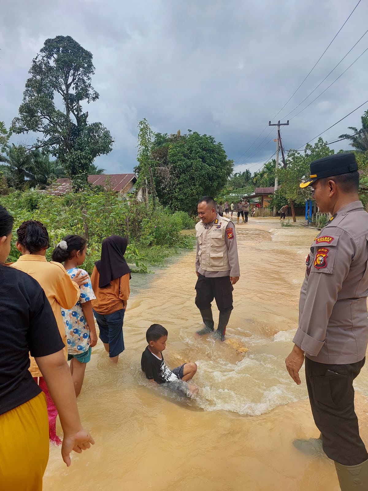 Hibur Anak-anak Terdampak Banjir, Kapolsek Kampar Kiri Hilir Berikan Bantuan.