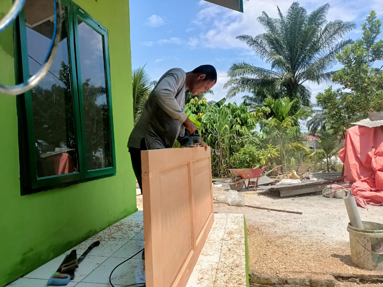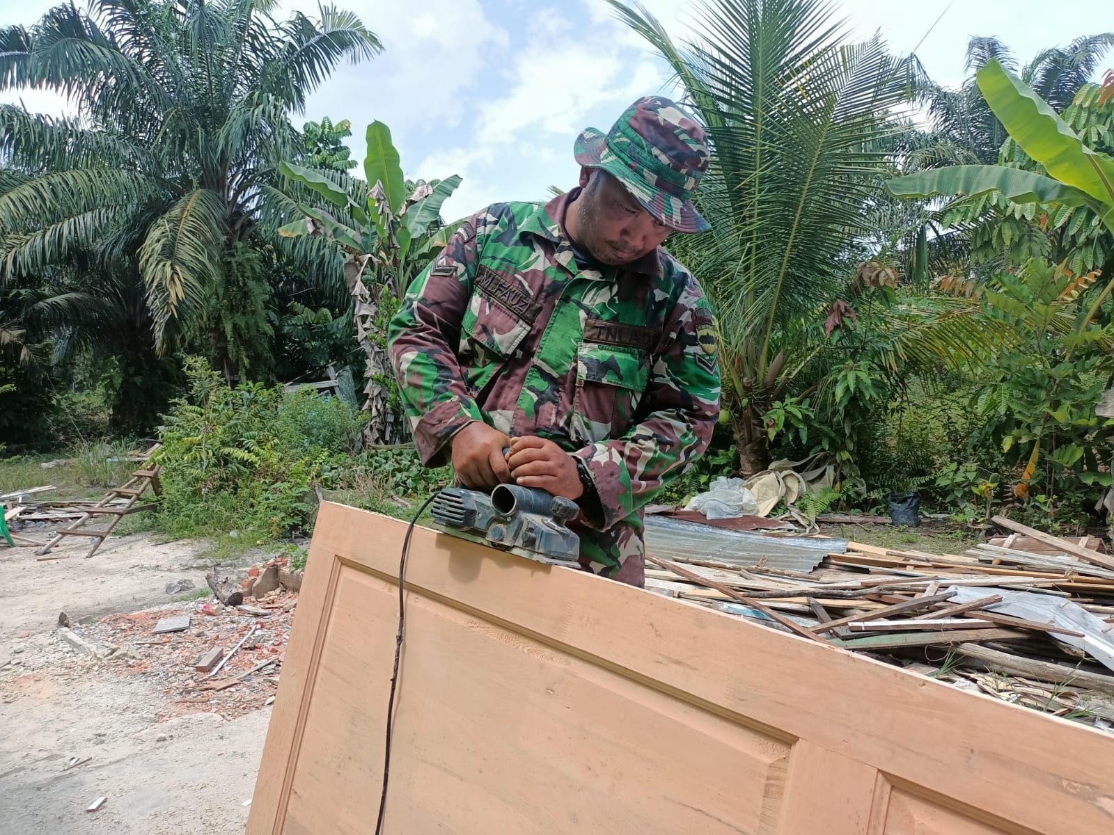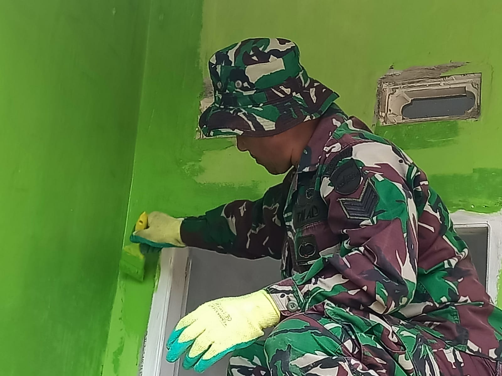 Sersan Kepala (Serka) Adeng Supratna yang tergabung Satuan Tugas (Satgas) TNI Manunggal Membangun Desa (TMMD) Reguler ke 114 Kodim 0301/Pekanbaru dengan cekatan mengerjakan pengecatan dinding dan kusen jendela Rumah Tidak Layak Huni milik Prahara.
