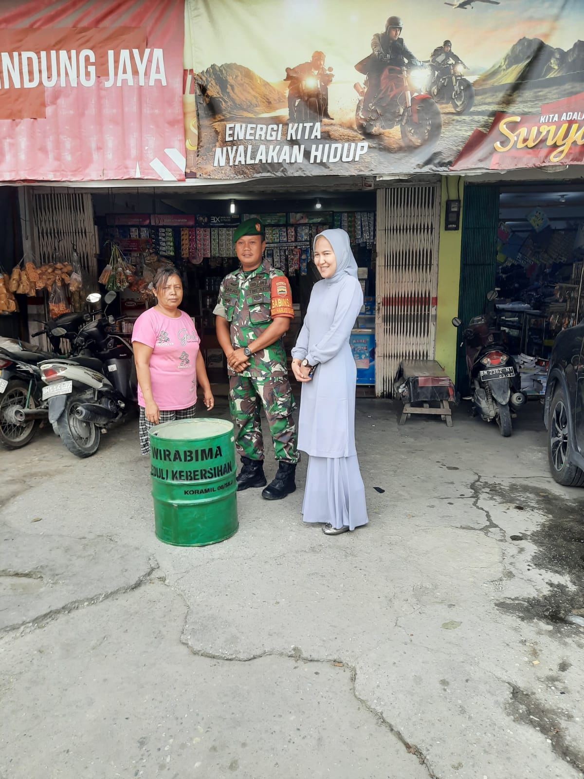 Sertu Parjo, Koramil 06/Skj Kodim 0301/Pekanbaru melaksanakan giat pendistribusian tong sampah serta sosialisasi Surat Edaran Pj Wako Pekanbaru tentang kewajiban pelaku usaha agar menyediakan wadah sampah di depan tempat usaha, toko dan ruko.