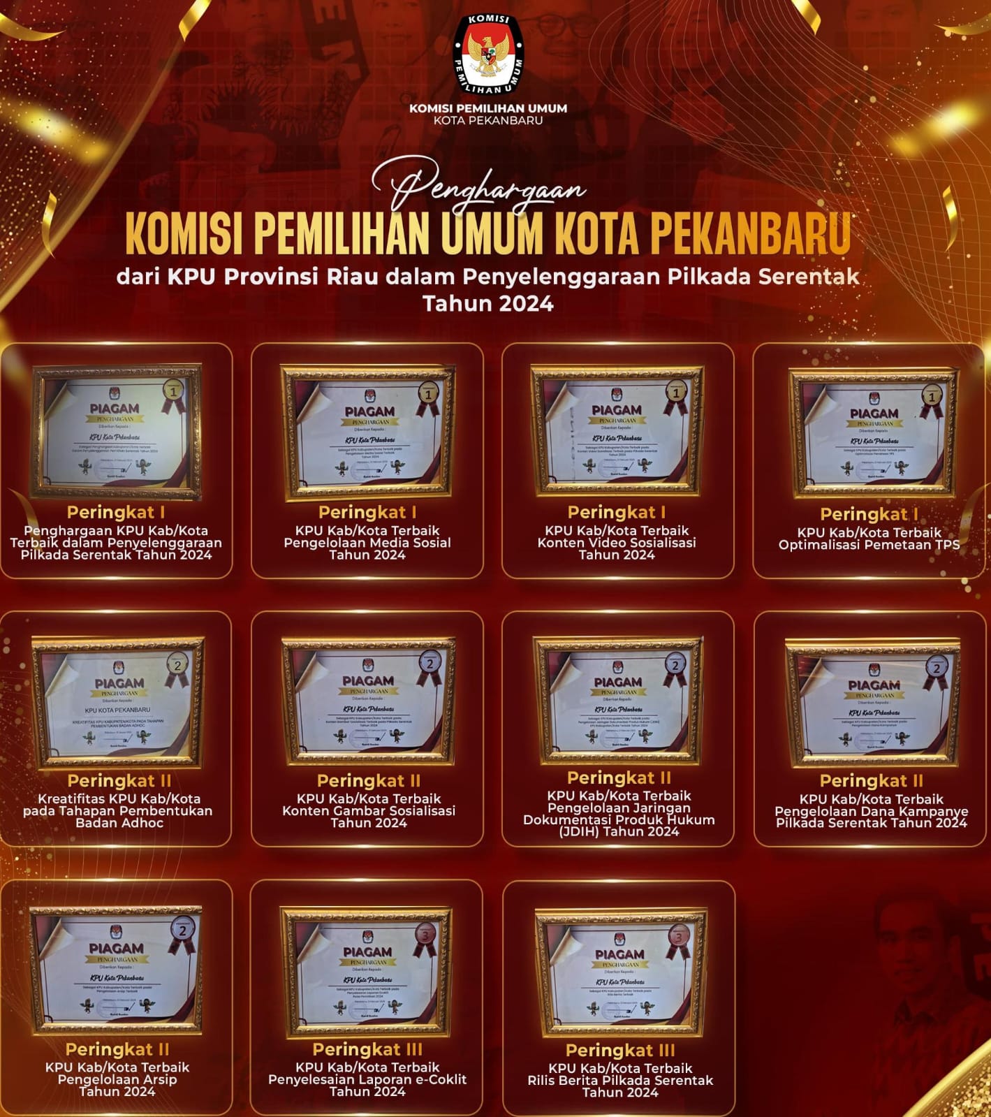 KPU Pekanbaru Raih 11 Penghargaan, Dinobatkan Sebagai Penyelenggara Pemilihan Terbaik.