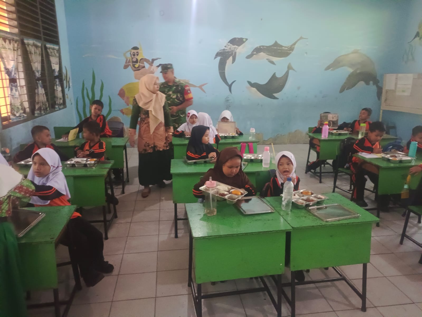 Sertu Sutan Siregar Bagikan Makanan Sehat ke SDN Annamiroh. Anak Murid: “Terima Kasih, Bapak.