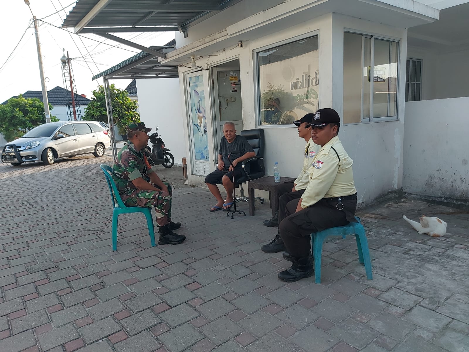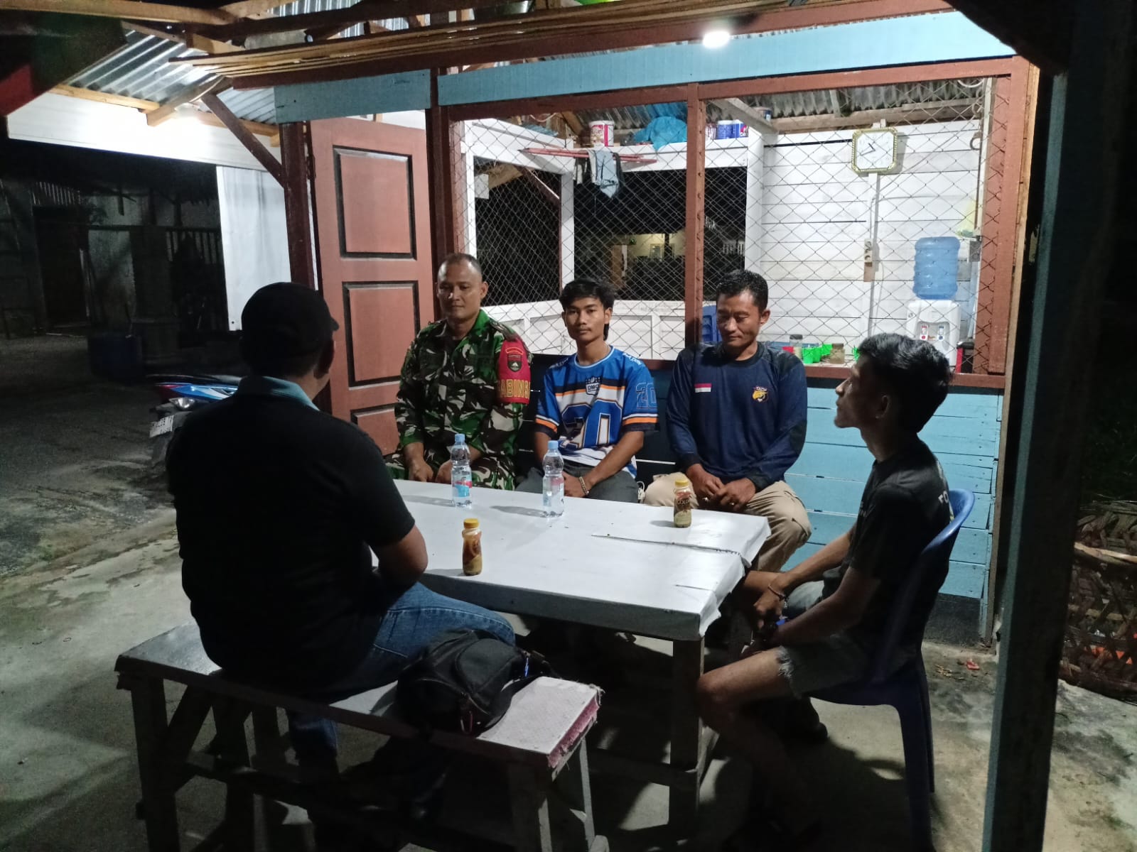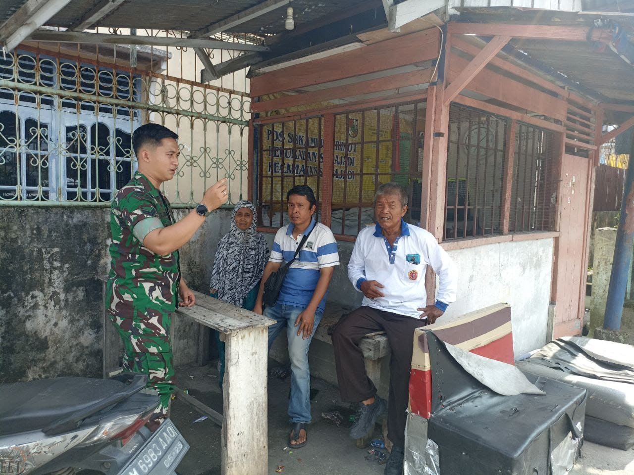 Babinsa Serka Wiyono Jalin Komsos dengan Warga dan Petugas Keamanan di Pos Penjagaan.
