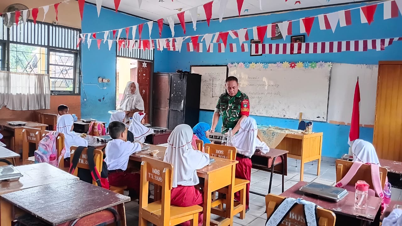 Babinsa Sertu Jhoni Janan Dampingi Tim SPPG Berikan Makanan Bergizi Gratis di SDN 05.
