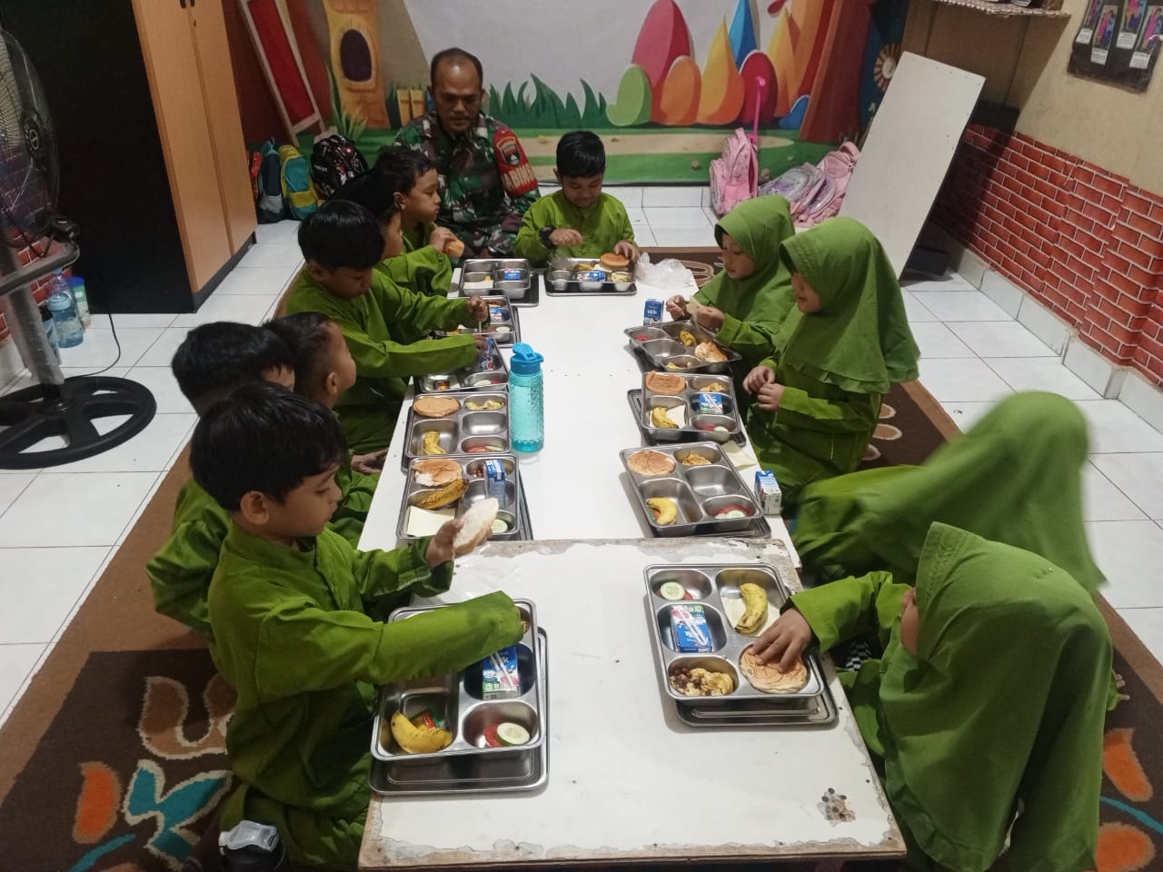Babinsa Serda Tulus Batuara Bagikan Makanana Bergizi Gratis Kepada Murid TK Aisyiyah.