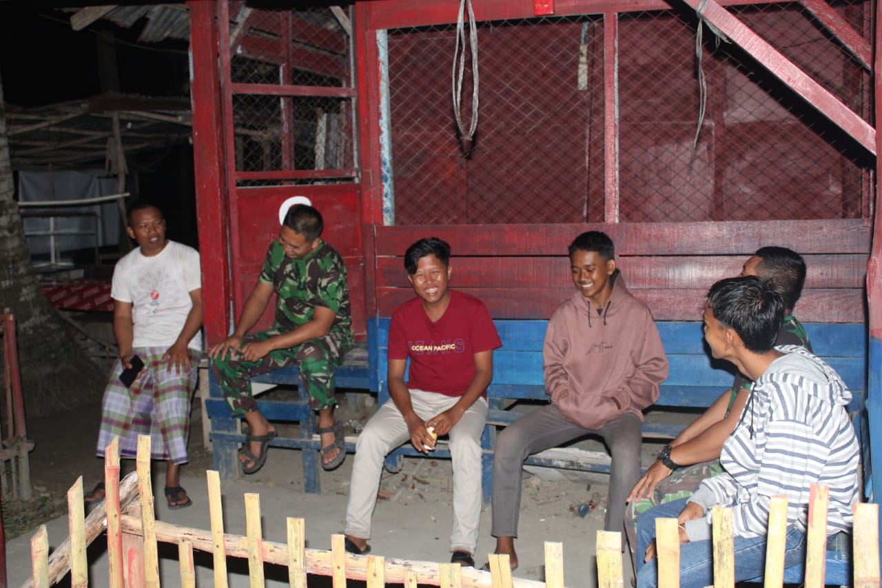 Anggota Satgas TNI Manunggal Membangun Desa (TMMD) ke 114 Kodim 0301/PBR bersama warga Jalan Ros RT 05 RW 02 melaksanakan ronda malam, Minggu malam.