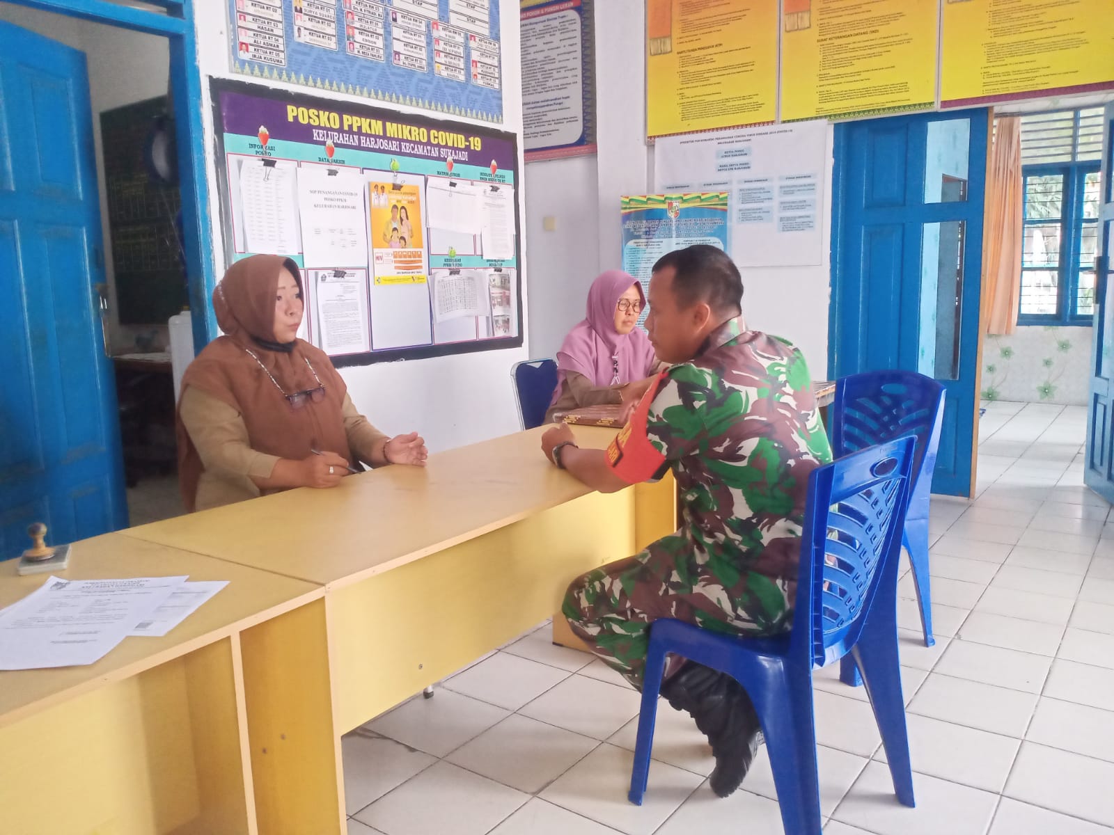 Sertu Parjo melaksanakan giat komsos dengan Sekretaris Kelurahan Gusnihayati dan Kasi Pemerintahan Wahyuningsih di kantor Kelurahan Harjosari Jalan Bunga Kertas Kecamatan Sukajadi kota Pekanbaru, Selasa.