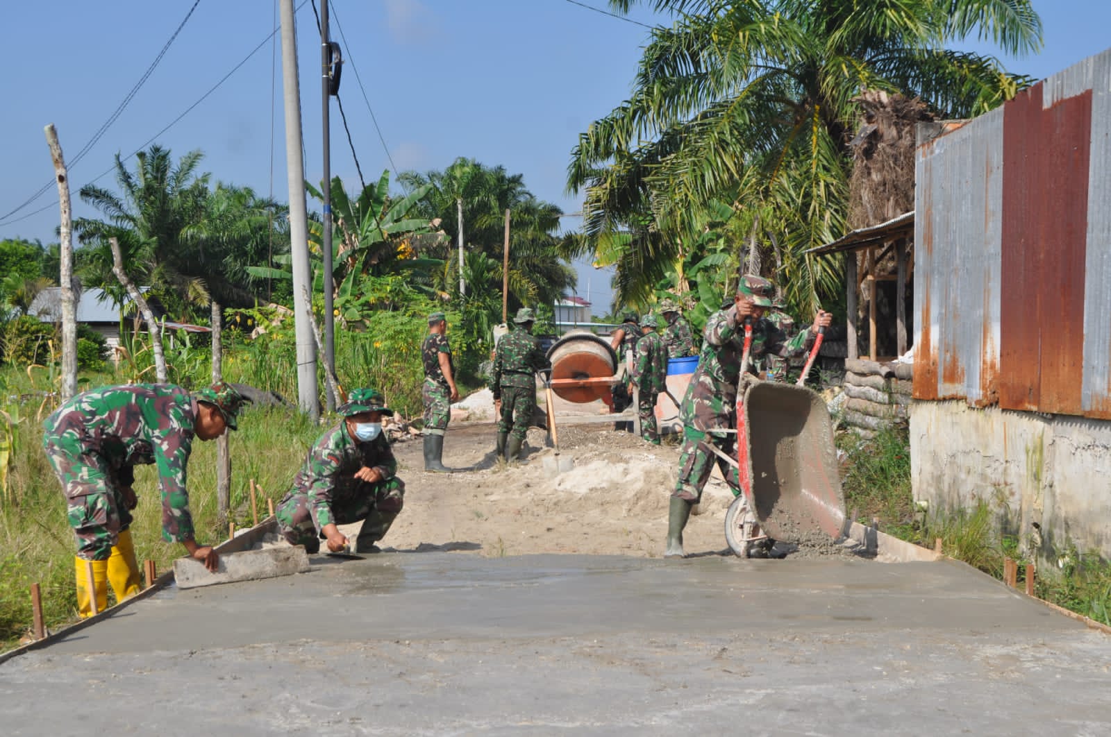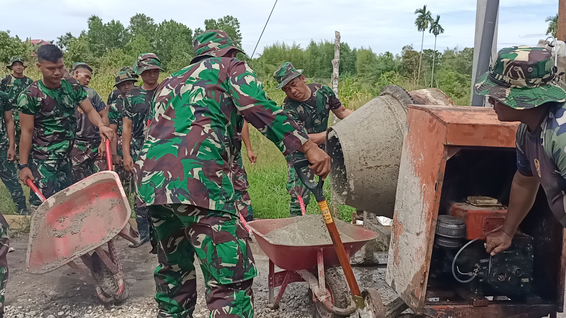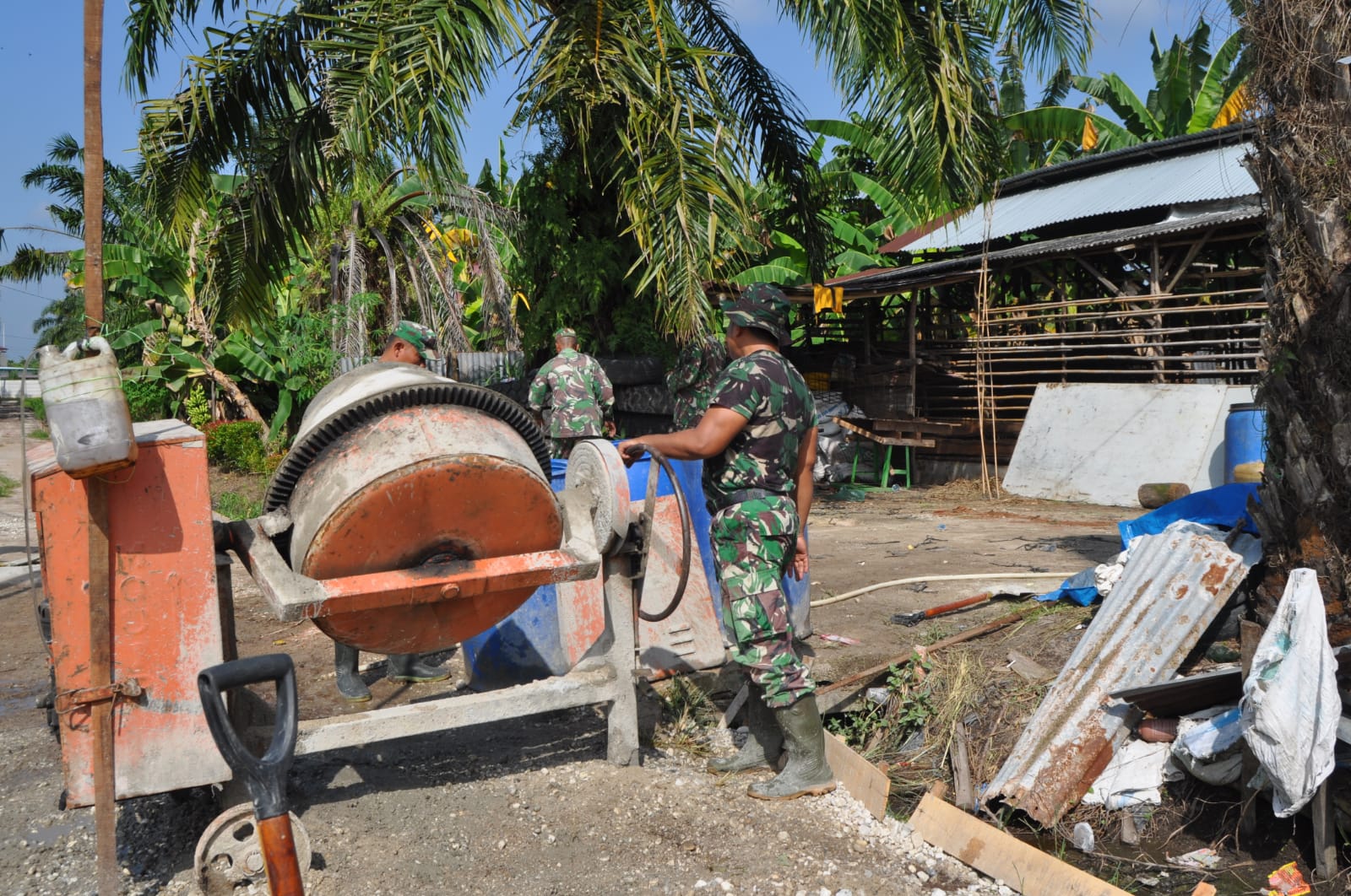 Satuan Tugas (Satgas) TNI Manunggal Membangun Desa (TMMD) ke 114 Kodim 0301/PBR masih tetap bersemangat mengangkut material pasir, semen, kerikil dimasukkan ke mulut mesin molen dalam pengerjaan pengecoran di Jalan Bunga Tombak Kelurahan Sialang.
