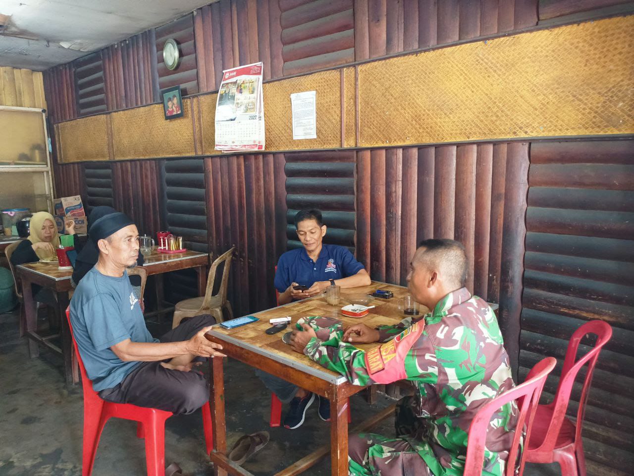Serka Nasaruddin, Anggota Koramil 06/Sukajadi melakukan komunikasi sosial dengan tokoh masyarakat RW 10 Suroso dan warga lainnya di salah satu warung di Jalan Taman Karya Kelurahan Tuah Karya Kecamatan Tuah Madani, Kamis.