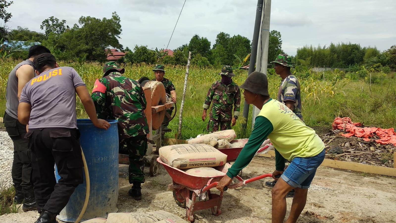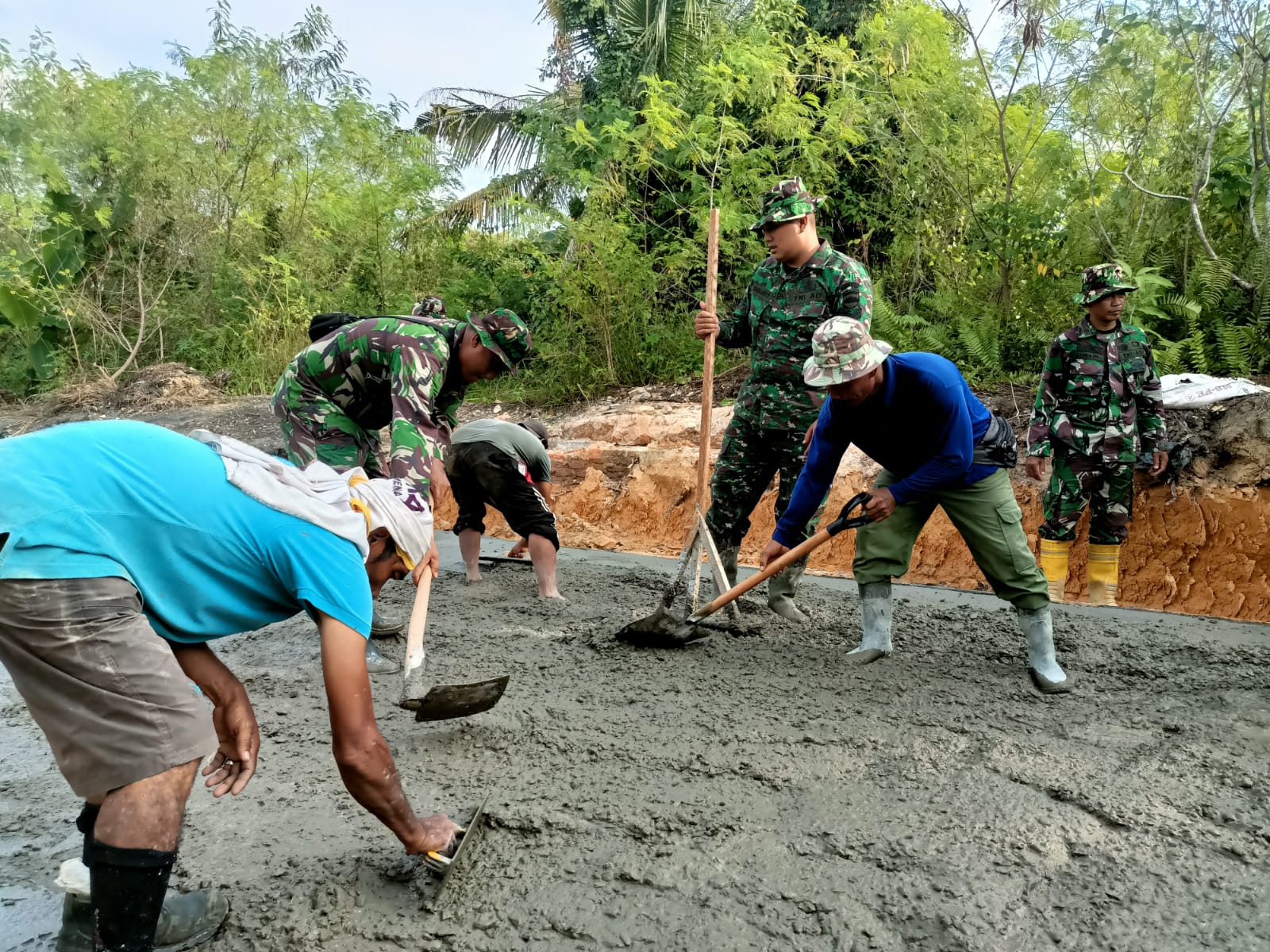 Saling mendukung dalam proses pengerjaan pengecoran semenisasi Jalan Bunga Tombak Kelurahan Sialang Rampai Kecamatan Kulim, personel Satgas TNI Manunggal Membangun Desa (TMMD) ke 114 Kodim 0301/PBR bersama warga tampak kompak saling bergotong-royong.