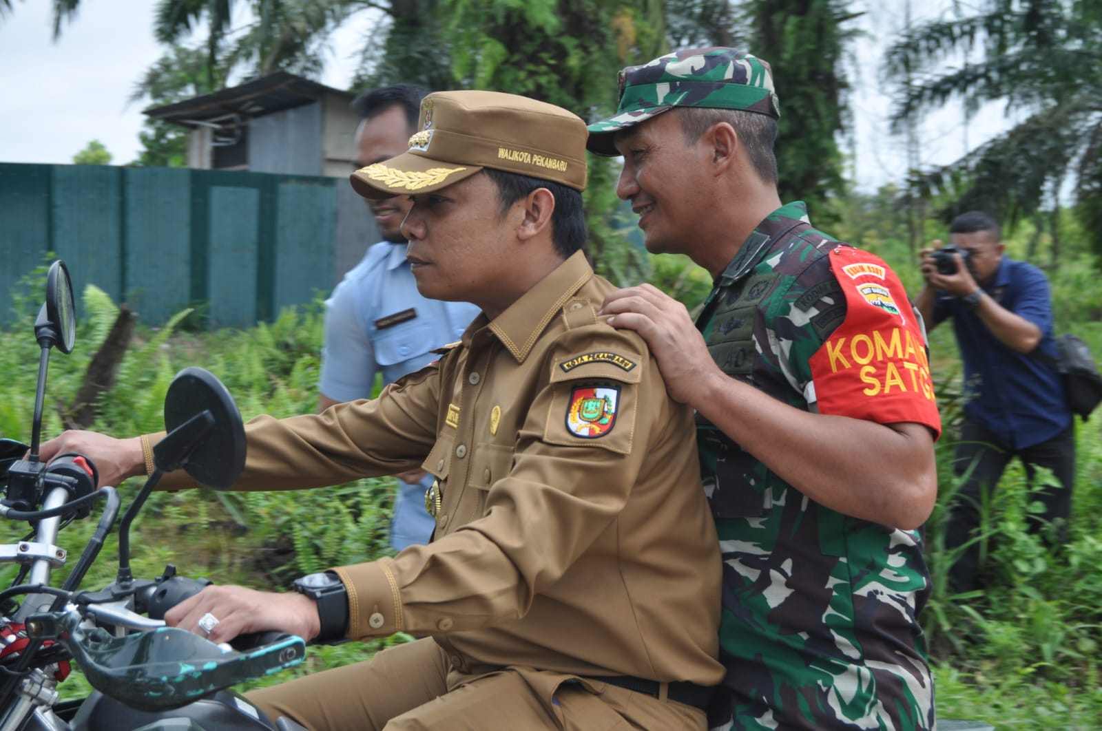 Usai menggelar apel upacara pembukaan TNI Manunggal Membangun Desa (TMMD) ke 114 di lapangan Perum Griya Teratai Indah, Selasa (26/7), Komandan Kodim (Dandim) 0301/PBR, Kolonel Inf Nur Rohman Zein bersama Penjabat Walikota Pekanbaru, Muflihun dengan.