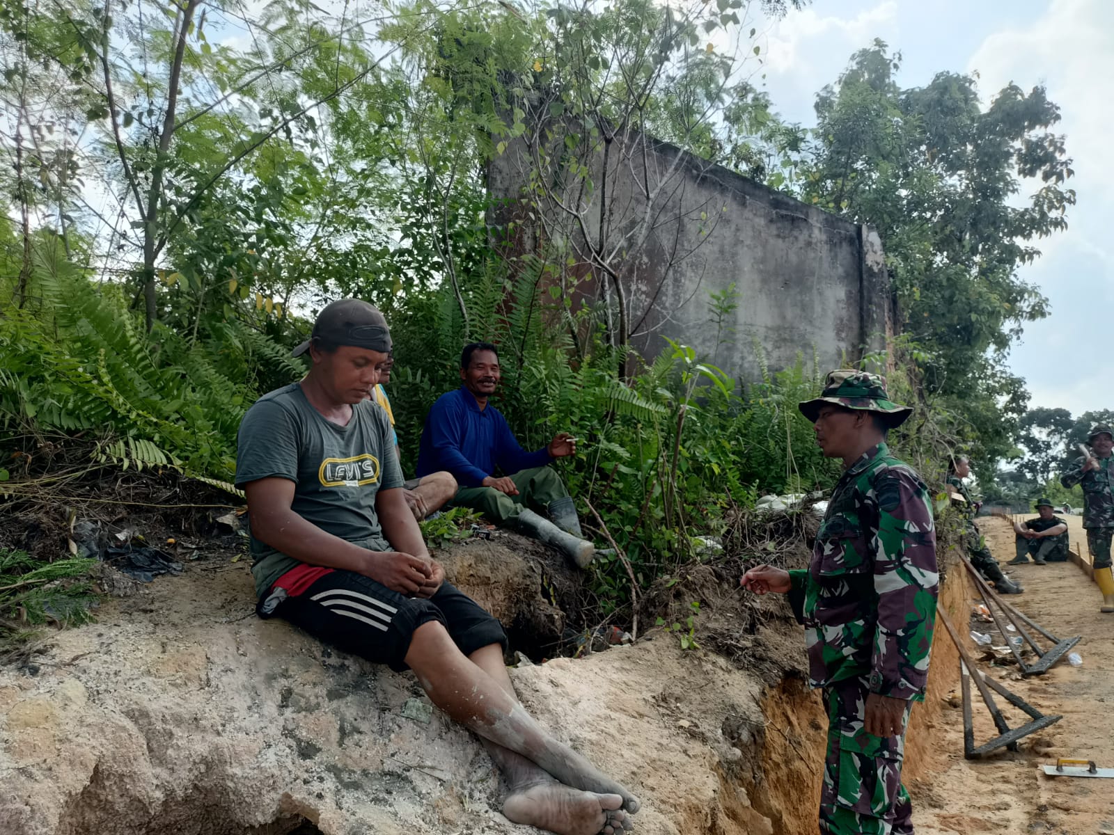 Cuaca panas terik matahari di hari Selasa, (26/7/2022), personel Satgas TNI Manunggal Membangun Desa (TMMD) ke 114 Kodim 0301/PBR istirahat sejenak melepas lelah berbincang-bincang dengan rekan sejawat bersama masyarakat di lokasi sasaran pengecoran.