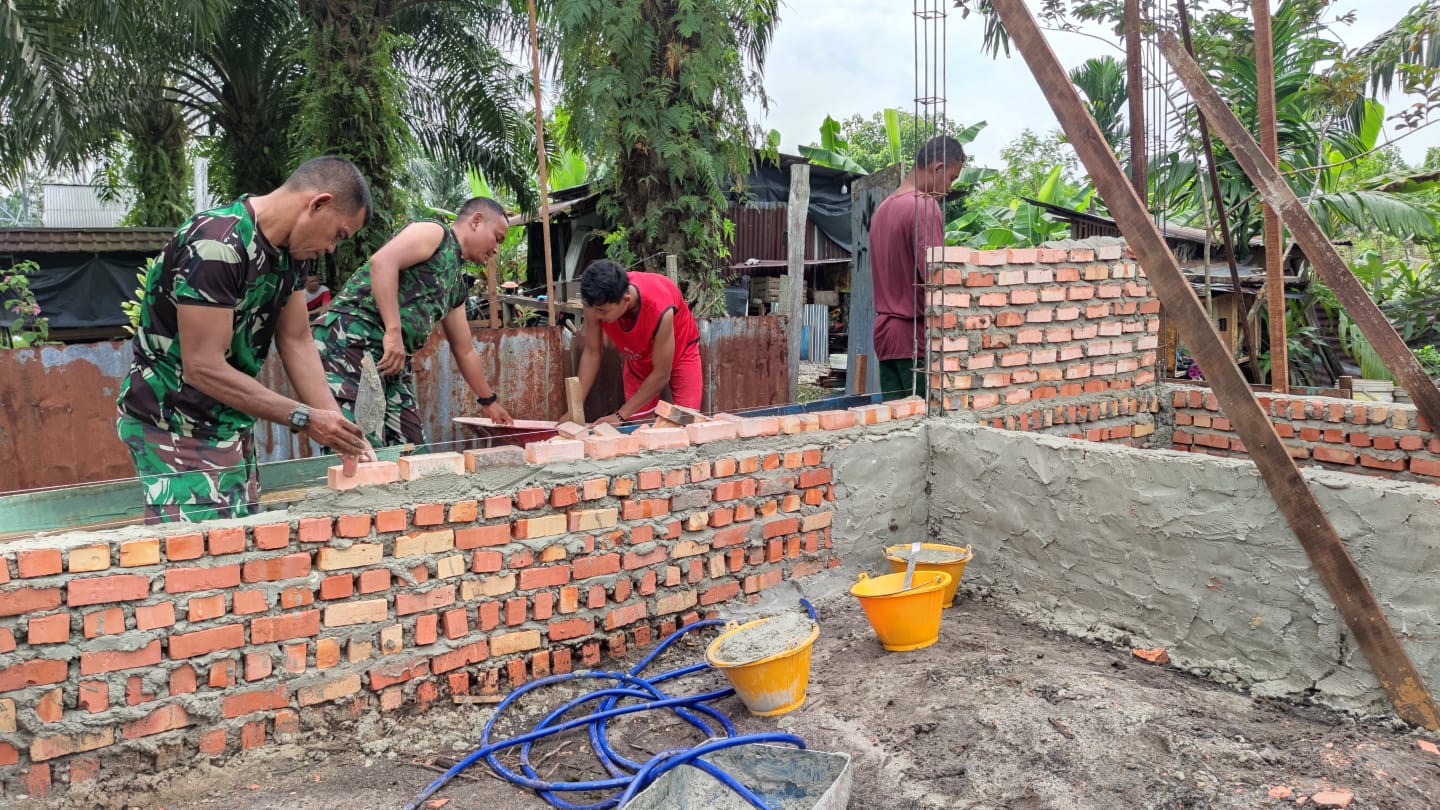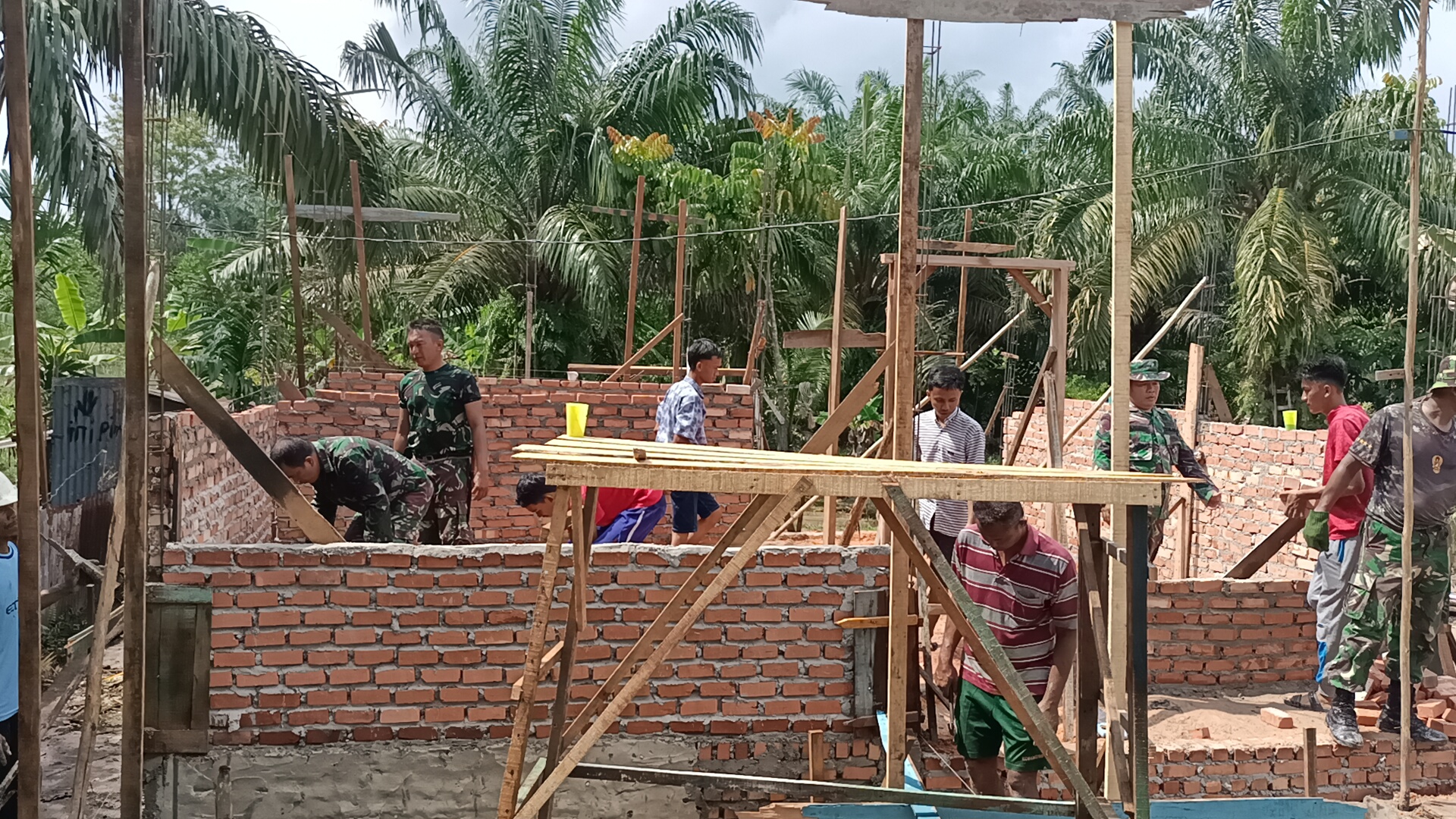 Tim Satuan Tugas (Satgas) Pra TNI Manunggal Membangun Desa (TMMD) ke 114 Kodim 0301/PBR bersama masyarakat kembali melanjutkan, mengerjakan dan memasang batu bata milik Prahara (50) salah warga yang menerima bantuan bedah.