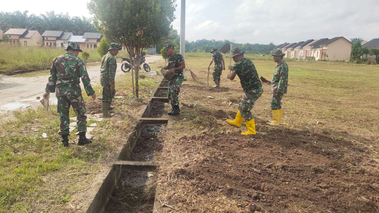 Anggota Satuan Tugas (Satgas) Pra TNI Manunggal Membangun Desa (TMMD) ke 114 Kodim 0301/PBR menggelar karya bakti membersihkan lapangan di Perumahan Griya Teratai Indah Jalan Teratai Kelurahan Sialang Rampai Kecamatan Kulim, Senin.
