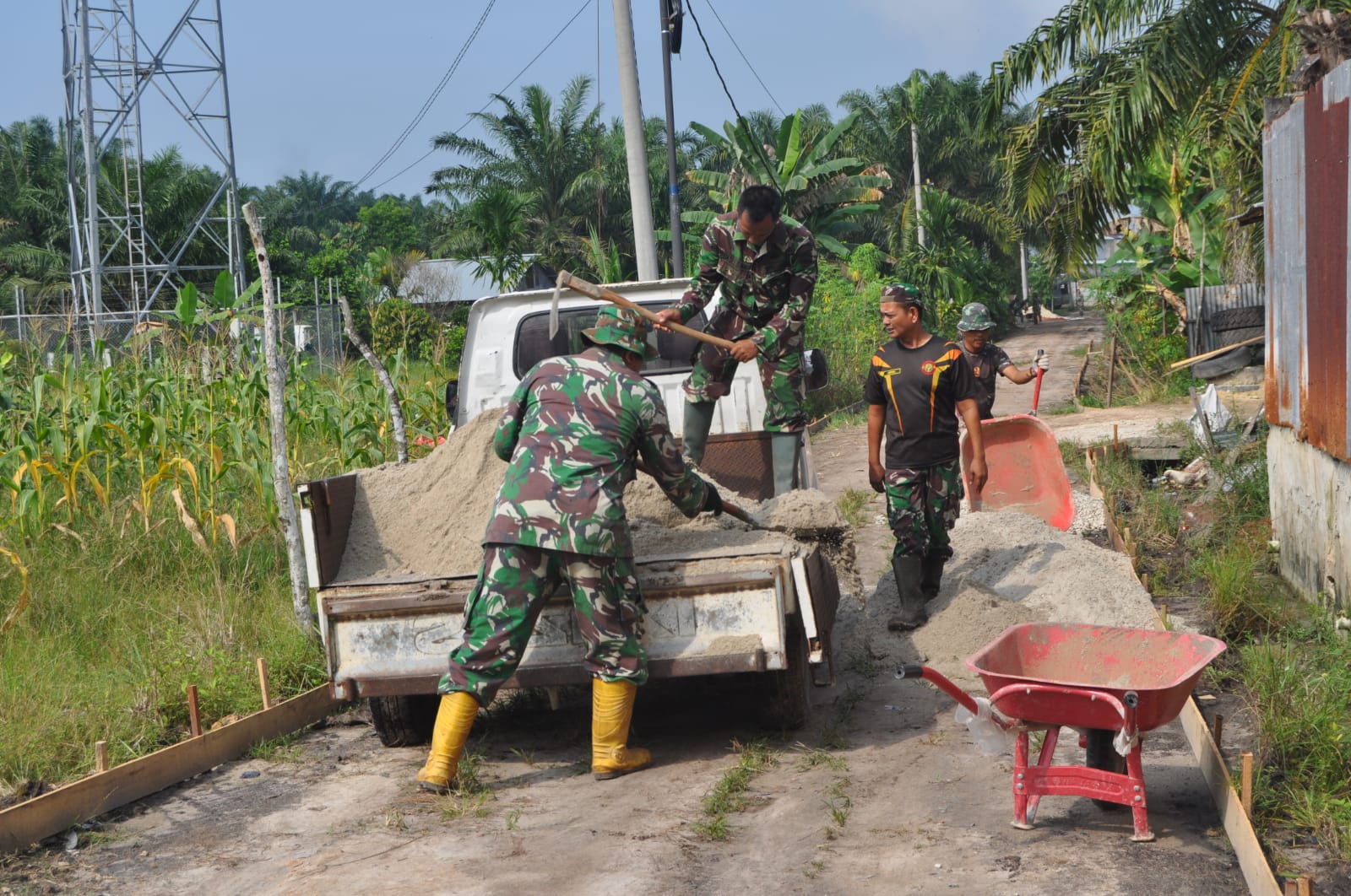 Babinsa Koramil 06/Sukajadi Kodim 0301/PBR, Serda Arman melaksanakan gotong royong pengecoran jalan Amanah RW 17 Kelurahan Sialang Munggu Kecamatan Tuah Madani, Minggu.