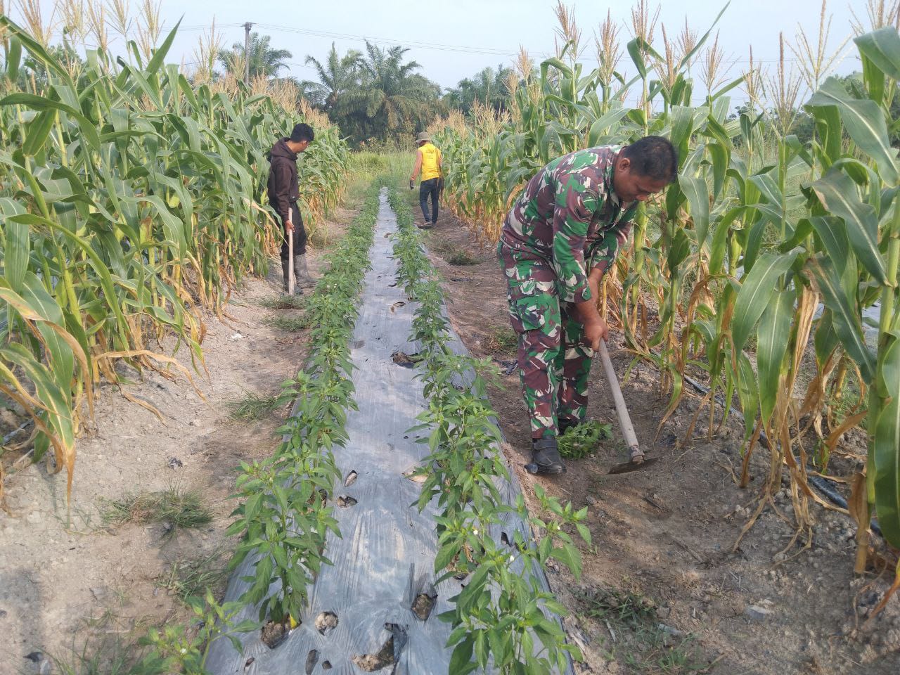 Bintara Pembina Desa (Babinsa) Koramil 06/Sukajadi Kodim 0301/PBR, Serda JH Pasaribu melaksanakan kegiatan pendampingan kelompok tani dengan menanam jagung di Kelurahan Tuah Madani Kecamatan Tuah Madani, Selasa.