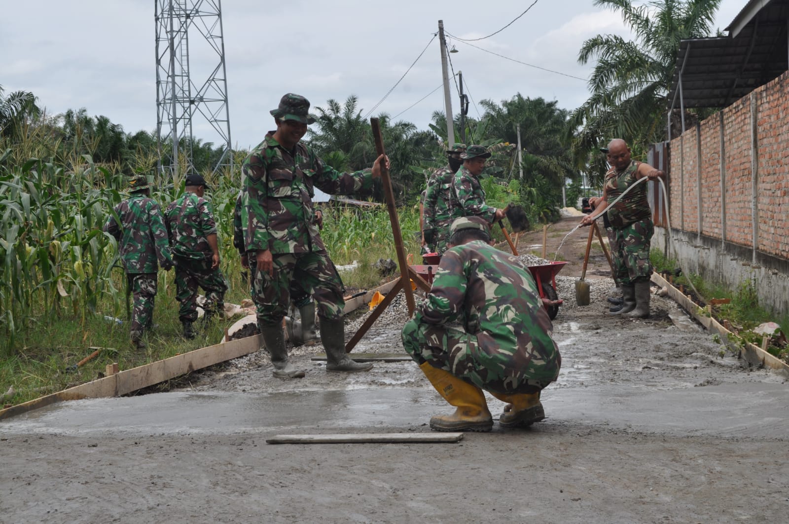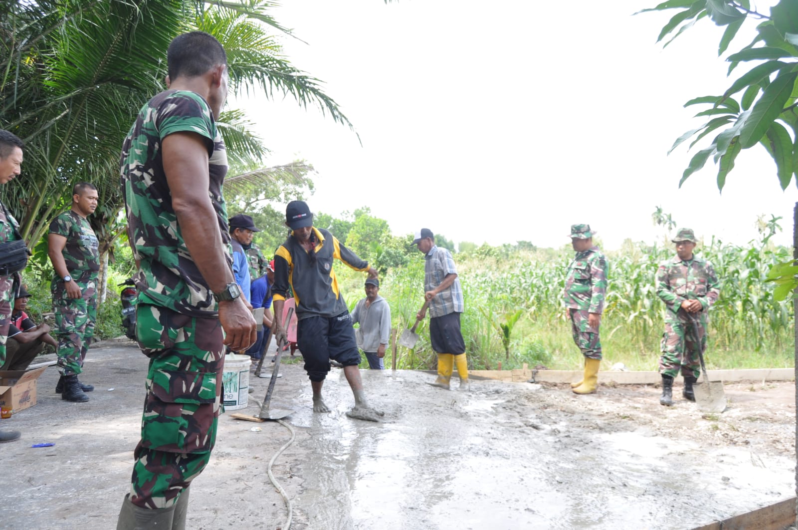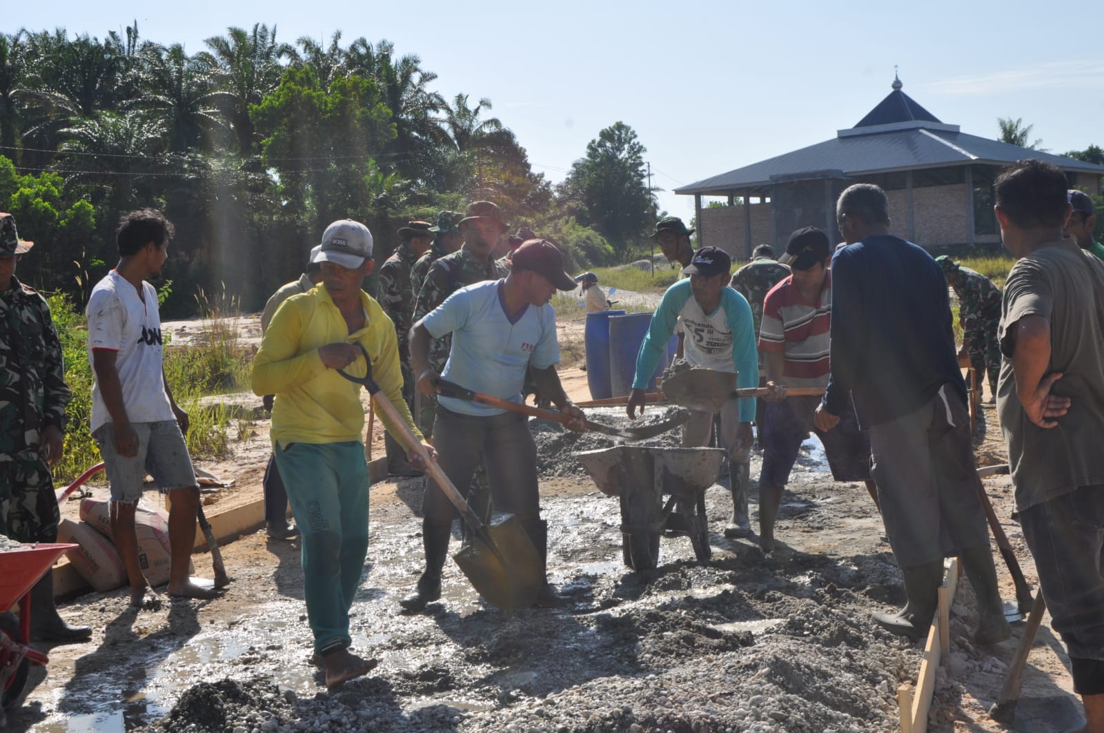 Dibawah terik matahari bersinar cukup terik, Satgas Pra TNI Manunggal Membangun Desa (TMMD) ke 114 Kodim 0301/PBR bersama warga bekerja mengecor jalan Alhamdulillah tak luntur.