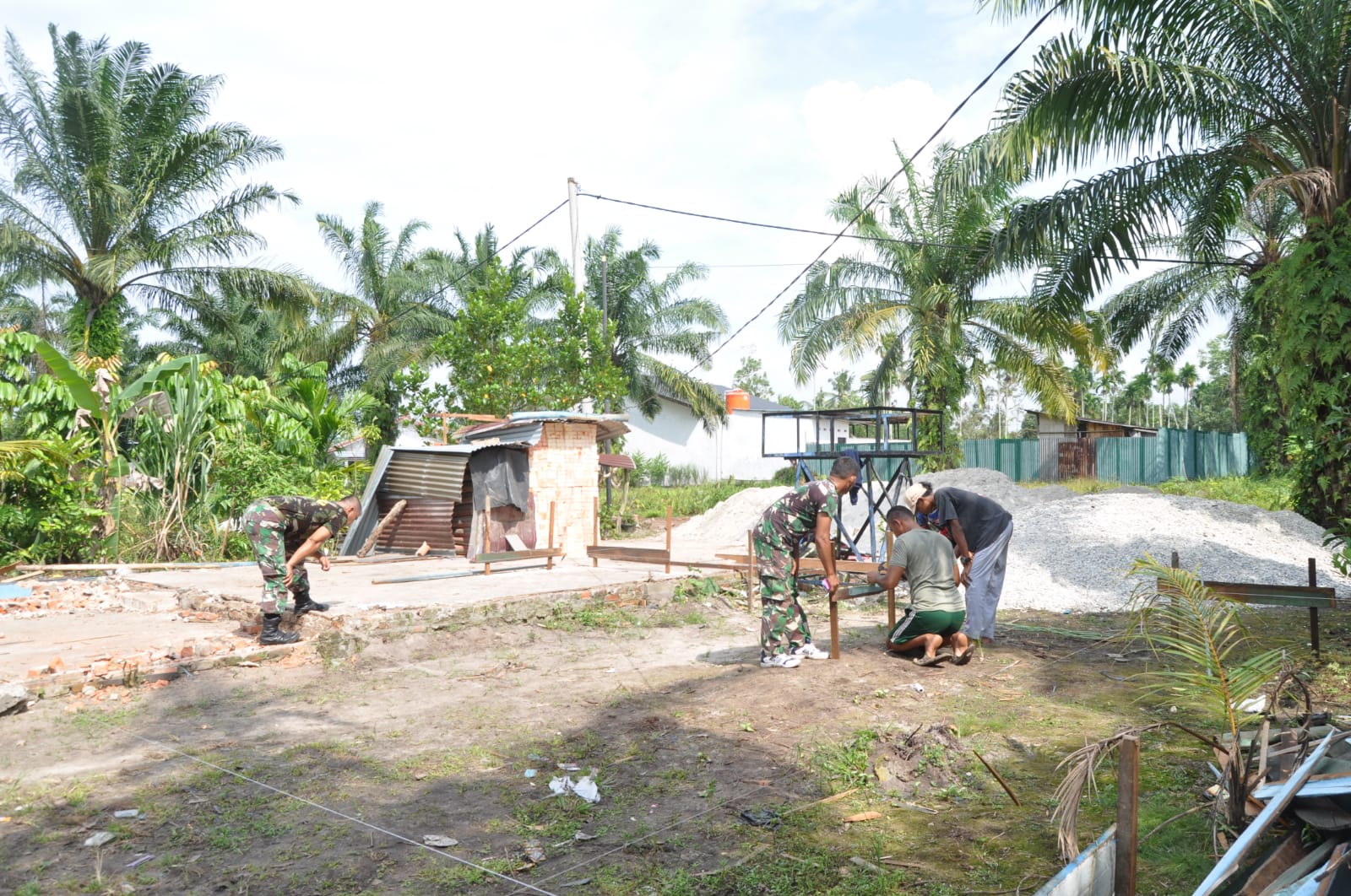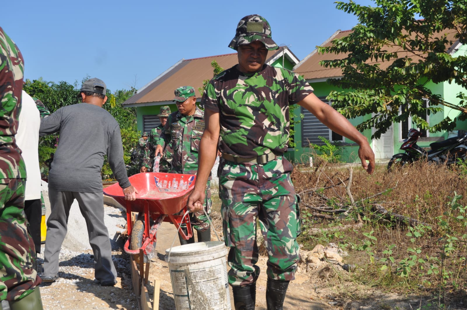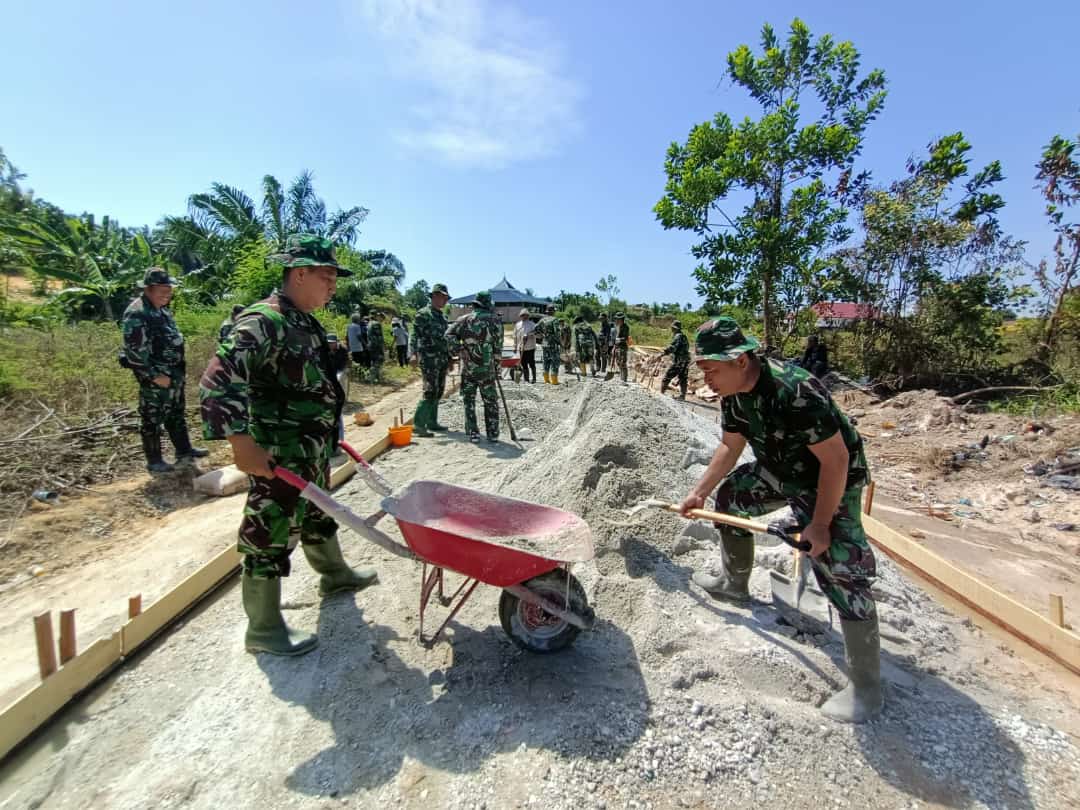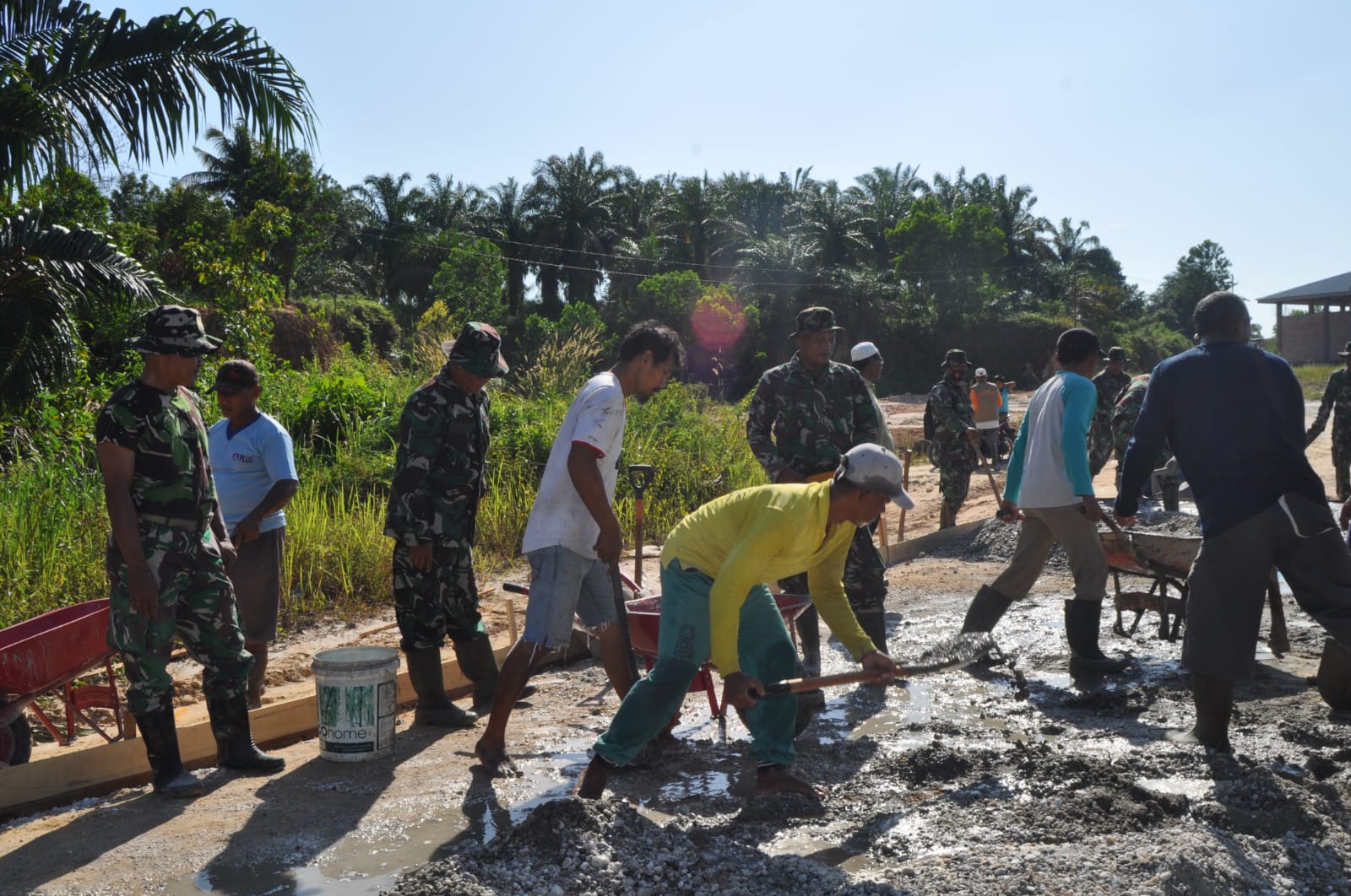 Dibawah terik matahari bersinar cukup terik, Satgas Pra TNI Manunggal Membangun Desa (TMMD) ke 114 Kodim 0301/PBR bersama warga bekerja mengecor jalan Alhamdulillah tak luntur.