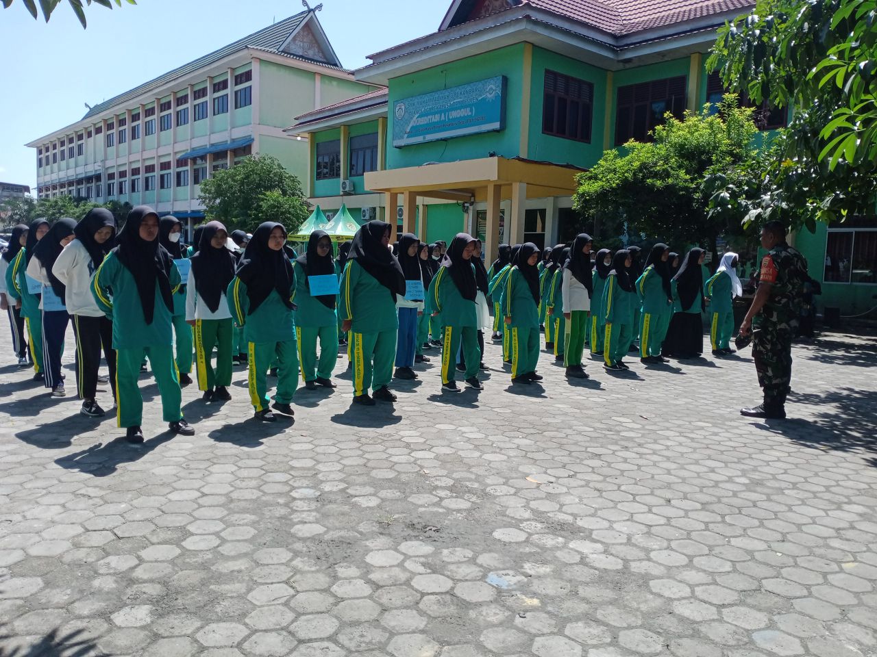 Babinsa Koramil 06/Sukajadi Serda M. Fauzi melaksanakan kegiatan pembinaan dan pembentukan Masa Pengenalan Lingkungan Sekolah (MPLS) dengan materi Peraturan Baris-Berbaris (PBB) di SMK Farmasi Ikasari Jalan Bangau Sakti Kelurahan Simpang Baru.