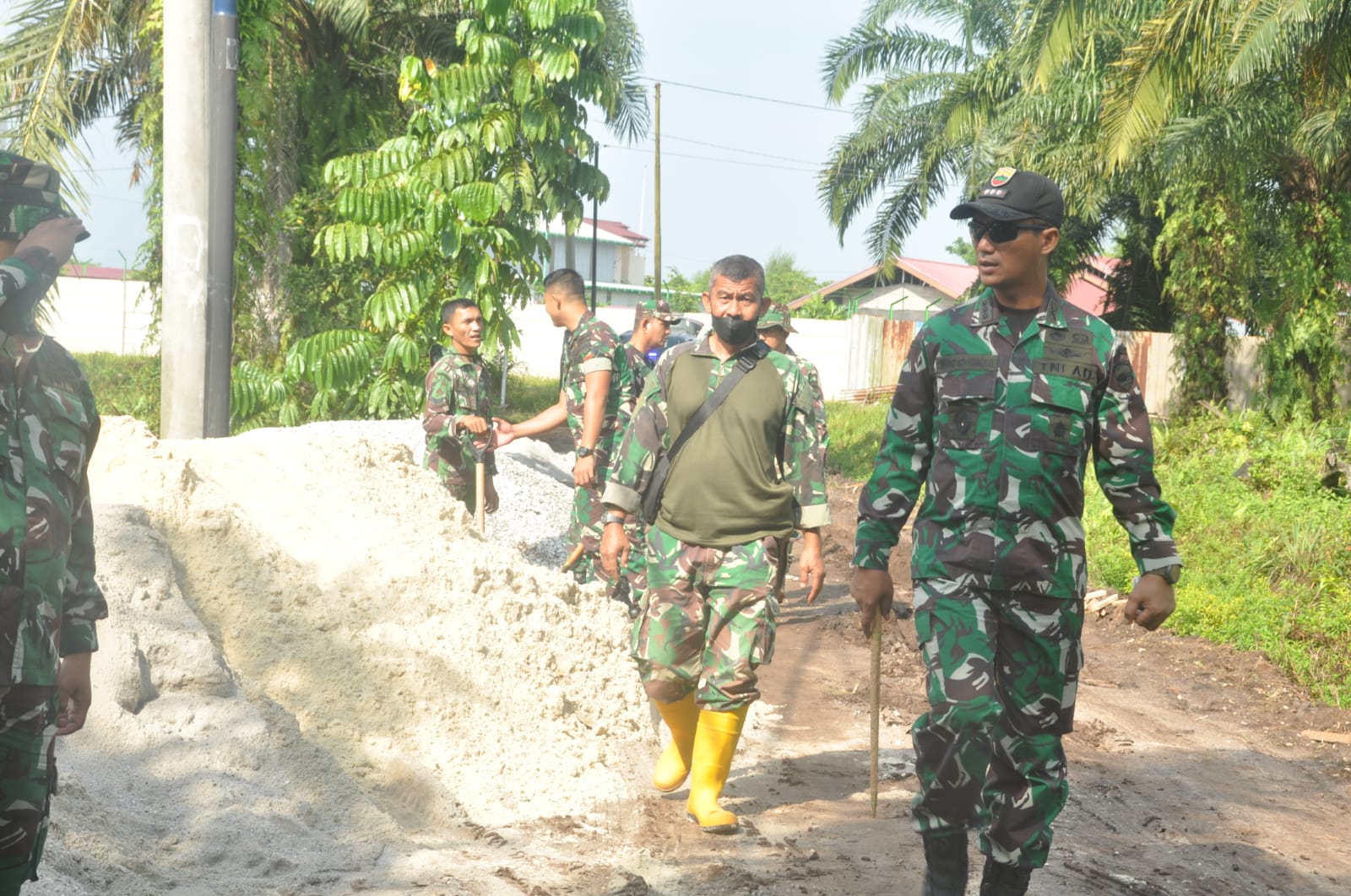 Pengecoran jalan yang merupakan kegiatan fisik program Pra TNI Manunggal Membangun Desa (TMMD) ke 114 Kodim 0301/PBR, memasuki hari keempat, Kamis(14/7) masih terus.