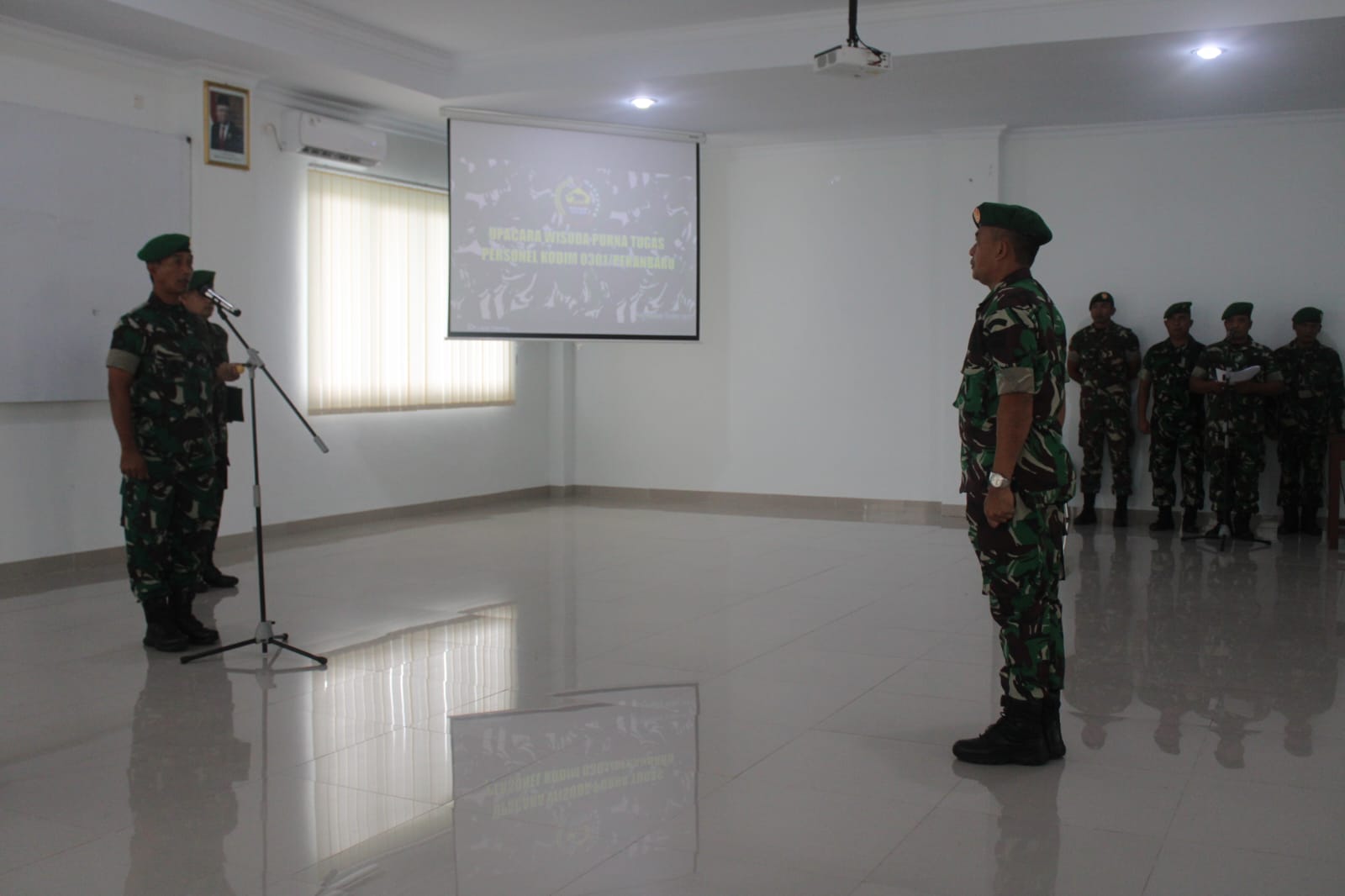 Komandan Kodim 0301/Pekanbaru Kolonel Inf Nur Rohman Zein, S.E., M.M memimpin upacara wisuda Purna Tugas 9 anggota di jajaran Kodim. Kegiatan ini dilaksanakan di Aula Makodim lantai II Jalan Ahmad Yani No 138 Kelurahan Pulau Karomah Kecamatan.