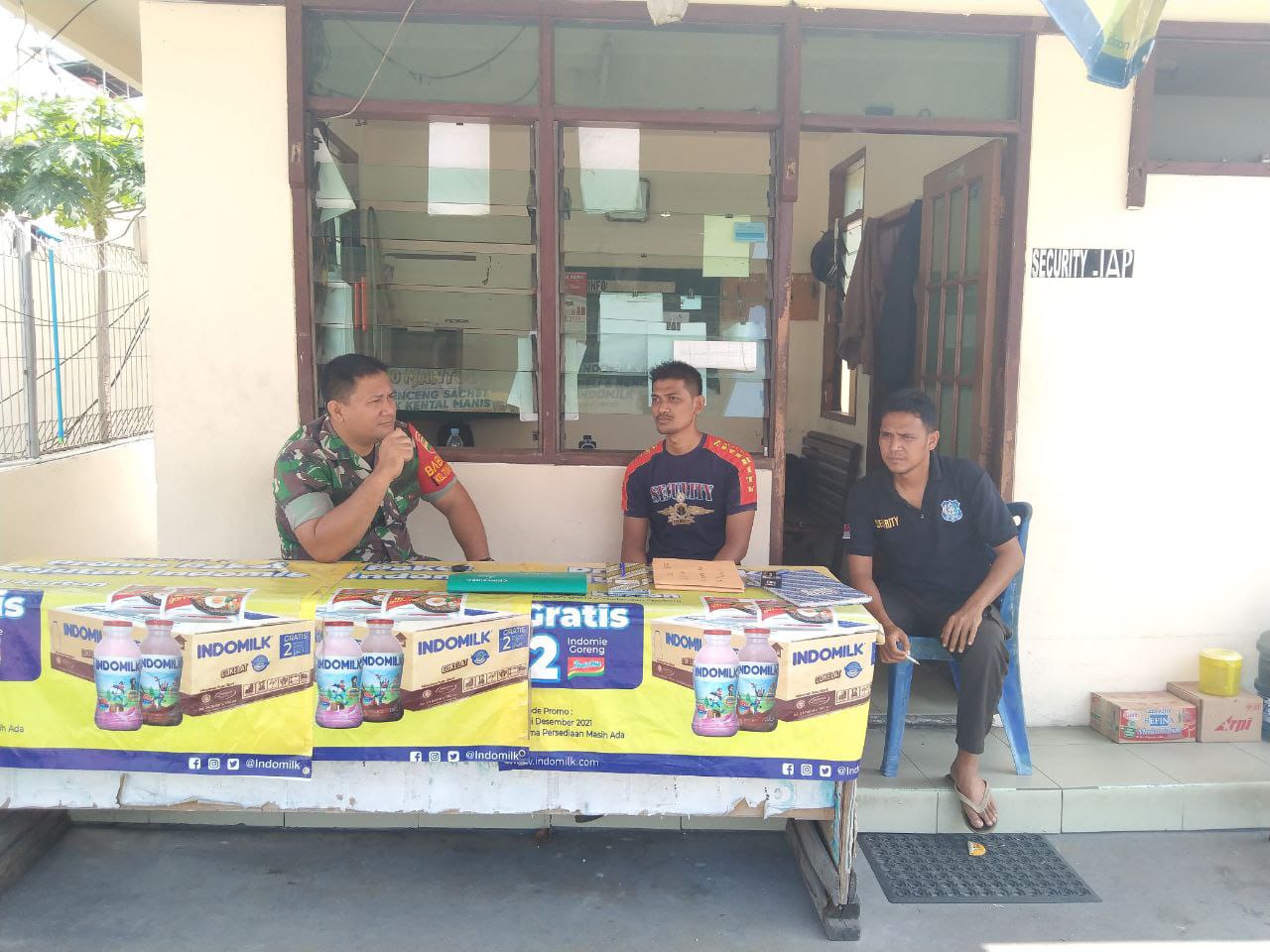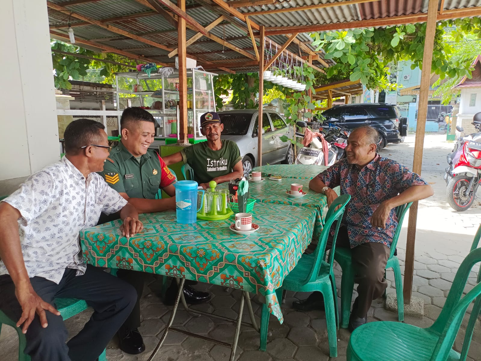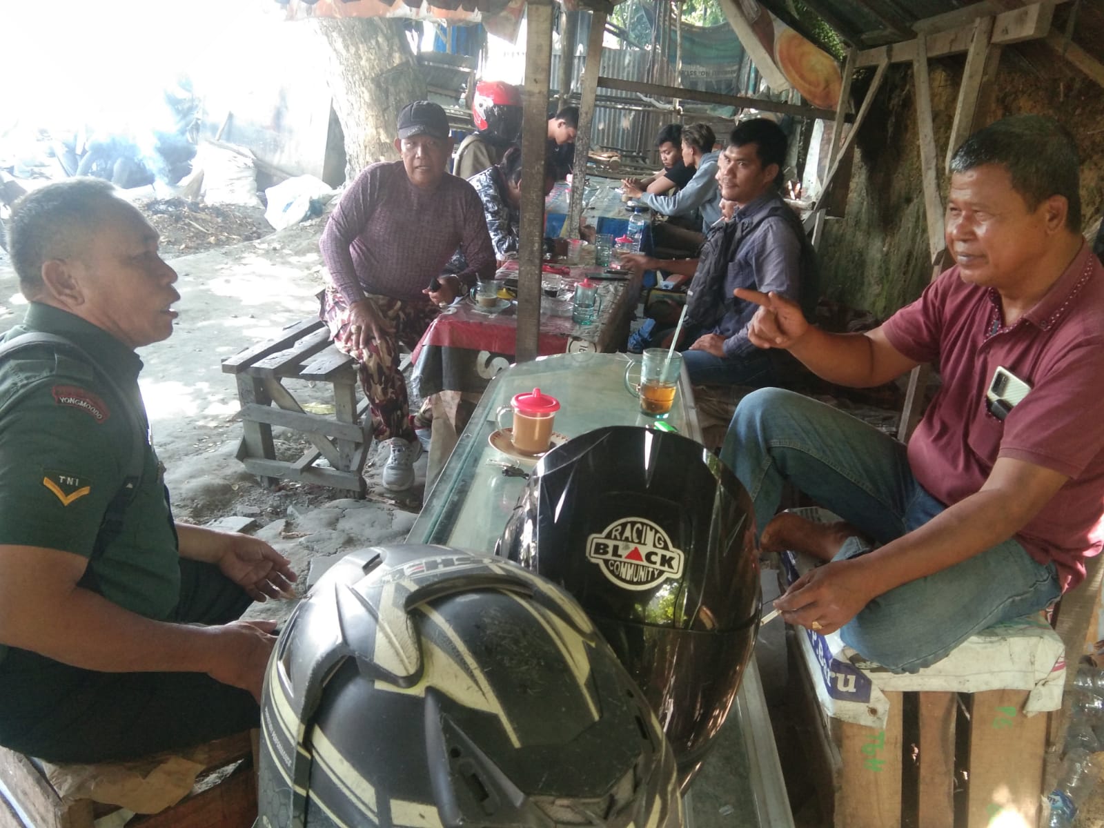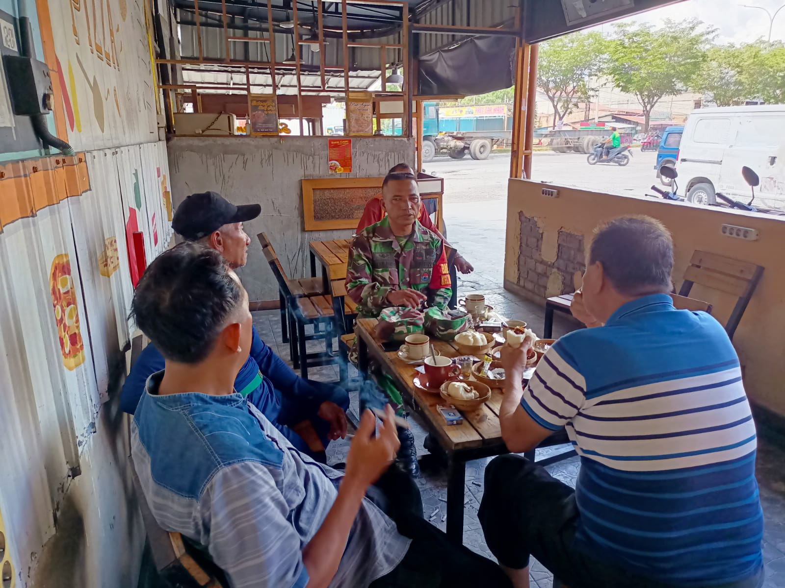 Guna membahas berkaitan keamanan ketertiban masyarakat (Kamtibmas) diwilayah binaan, Babinsa Serka J Tanjung melaksanakan komunikasi sosial bersama Ketua RW 08 Baharuddin dan Ketua RT 01 Sutrisno disalah satu warung kopi Jalan Soekarno Hatta.