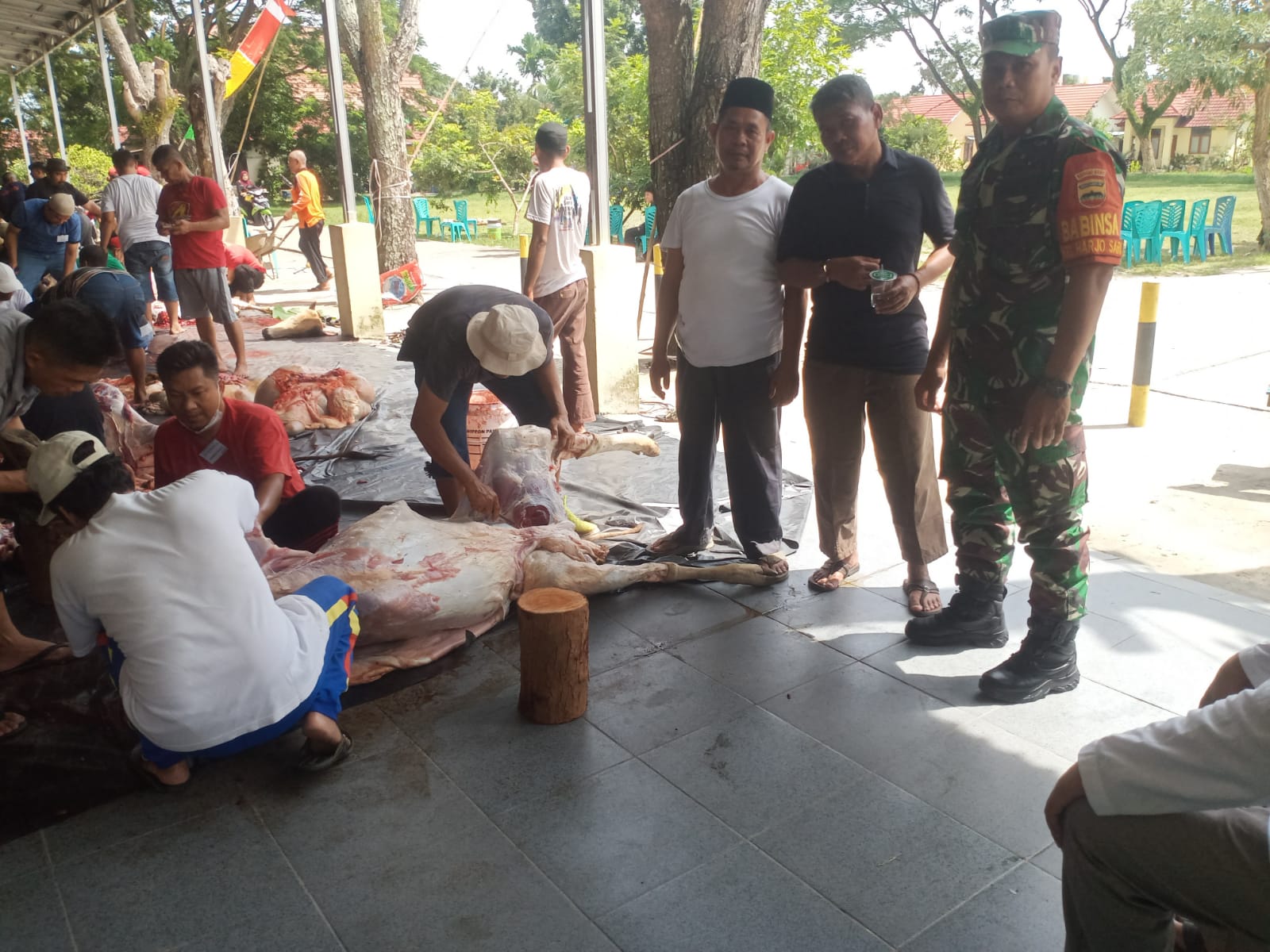 Sertu Parjo melakukan pemantauan pemotongan sapi Kurban di Masjid Al Muamalah Jalan Jati Kelurahan Harjosari Kecamatan Sukajadi kota Pekanbaru, Minggu.