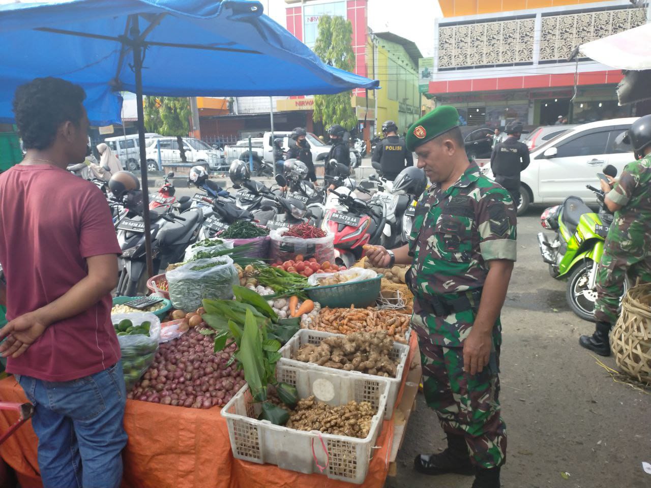 Warga dan pembeli serta pedagang selalu berinteraksi di pasar Cik Puan, Babinsa Koramil 06/Sukajadi Kodim 0301/Pekanbaru, Serka Adeng melaksanakan kegiatan penegakan disiplin mematuhi protokol kesehatan di pusat perbelanjaan yang berada di Jalan.