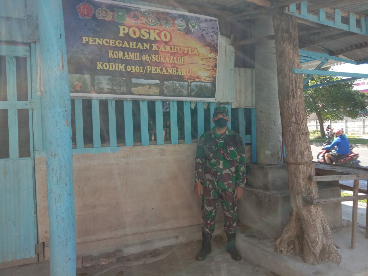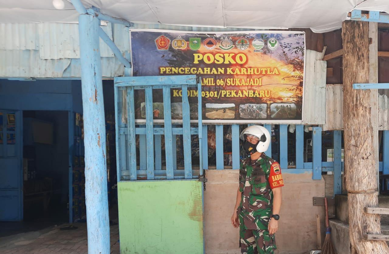 Babinsa Koramil 06/Sukajadi Sertu Wiyono melaksanakan patroli & sosialisasi cegah Karhutla, diwilayah Jalan Naga Sakti RT 03 RW 03 Kelurahan Binawidya dan Jalan Kabun RT 02 RW 03 Kelurahan Air Putih Kecamatan Tuah Madani, Senin.