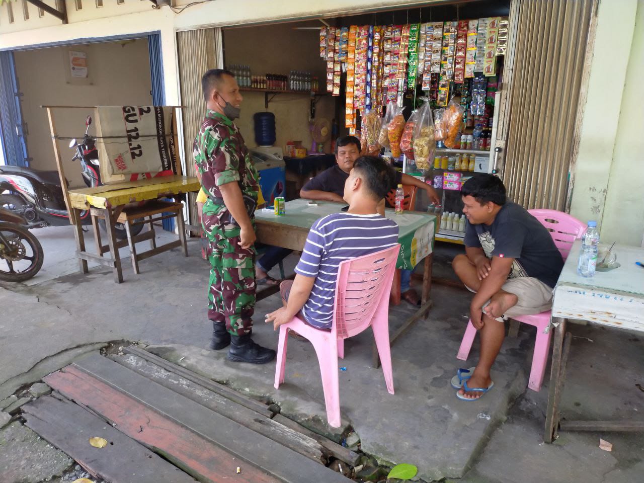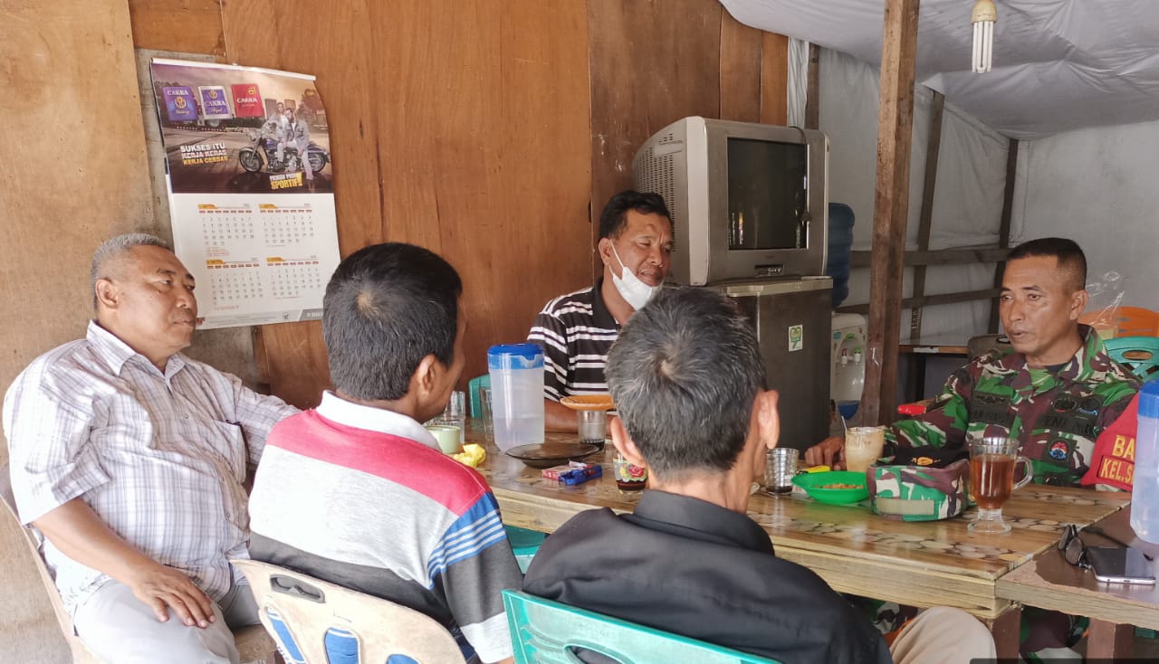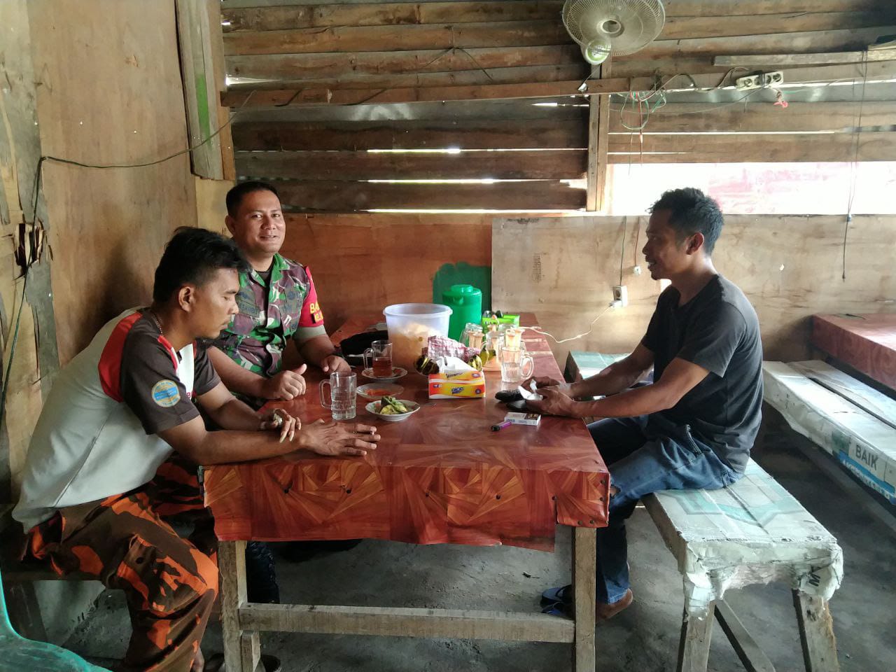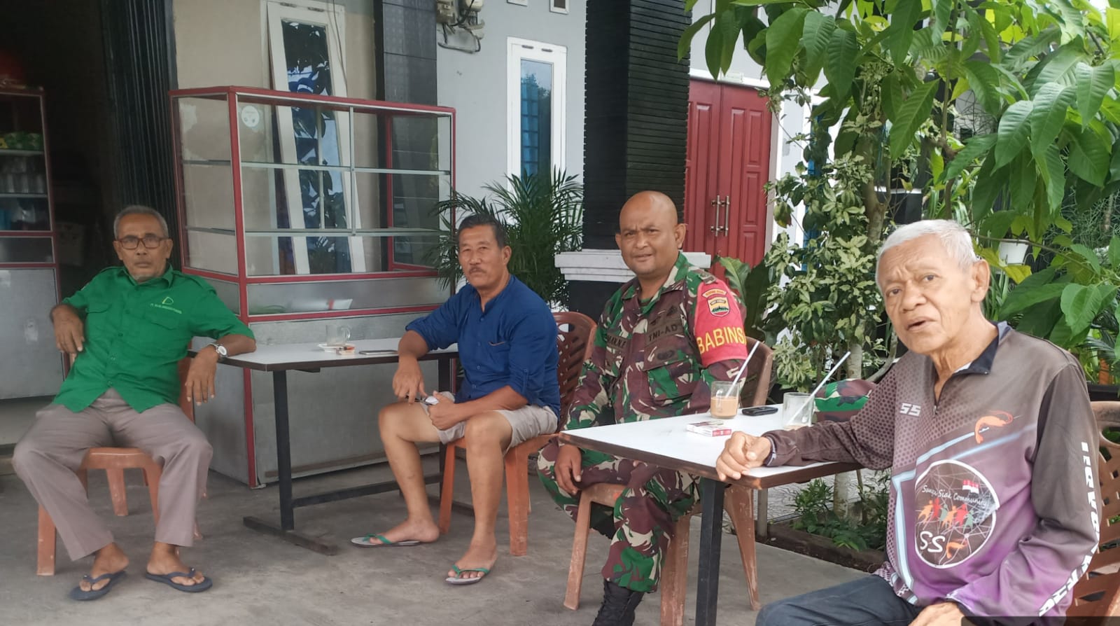 Serka J Tanjung, Babinsa Kelurahan Sidomulyo Barat wilayah Koramil 06/Sukajadi Kodim 0301/PBR melaksanakan komsos dengan Ketua RW 15 Saharudin dan Ketua RT 2 Afrinaldi Siagian di salah satu warung kopi Jalan Muhajirin Kecamatan Tuah Madani, Selasa.