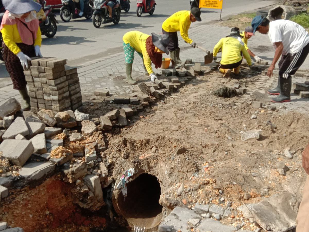 Babinsa Kelurahan Tobek Godang Serma Misbahudin, Koramil 06/Sukajadi Kodim 0301/PBR memonitor giat pembongkaran drainase yang tersumbat sehingga menimbulkan genangan air dan sering mengakibatkan terjadi banjir di Jalan Seroja/Soekarno- Hatta RT 03.