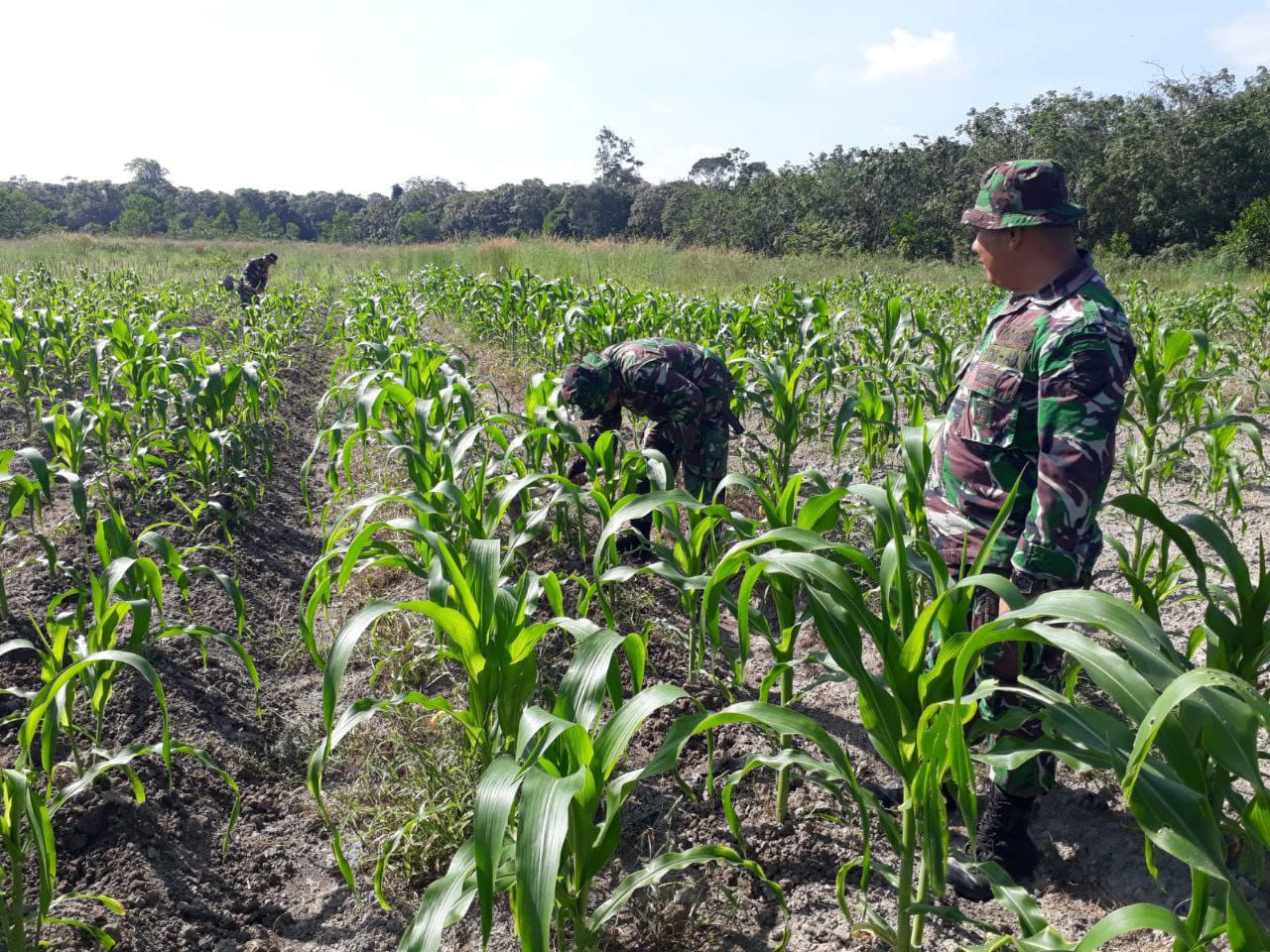 Sersan Mayor (Serma) Misbahuddin, Babinsa Koramil 06/Sukajadi melanjutkan kegiatan penggemburan tanah dan membersihkan rumput tanaman jagung areal milik Kodim 0301/PBR di demplot, Kecamatan Rumbai Timur, Pekanbaru, Rabu.