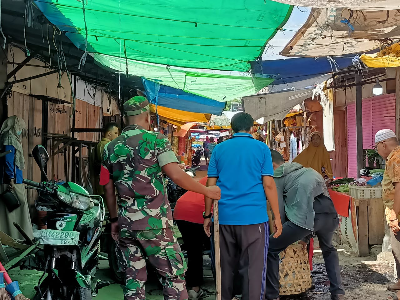 Serma Budi Mulia mengajak warga diwilayah binaan untuk melaksanakan gotong royong membuat dan membersihkan parit saluran air dan gorong-gorong di pasar tradisional Cik Puan Jalan Tuanku Tambusai Kelurahan Jadirejo Kecamatan Sukajadi, Selasa.
