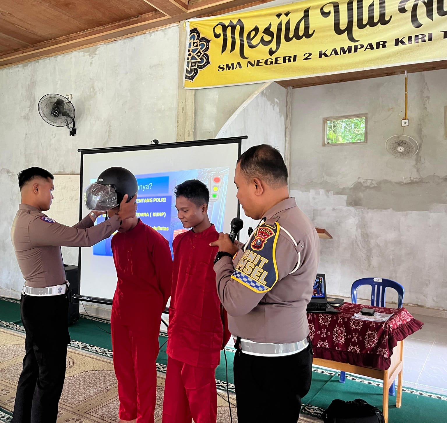 Satlantas Polres Kampar Edukasi Siswa SMA N 2 Kampar Kiri Tengah, Bagikan Helm SNI untuk Pelopor.