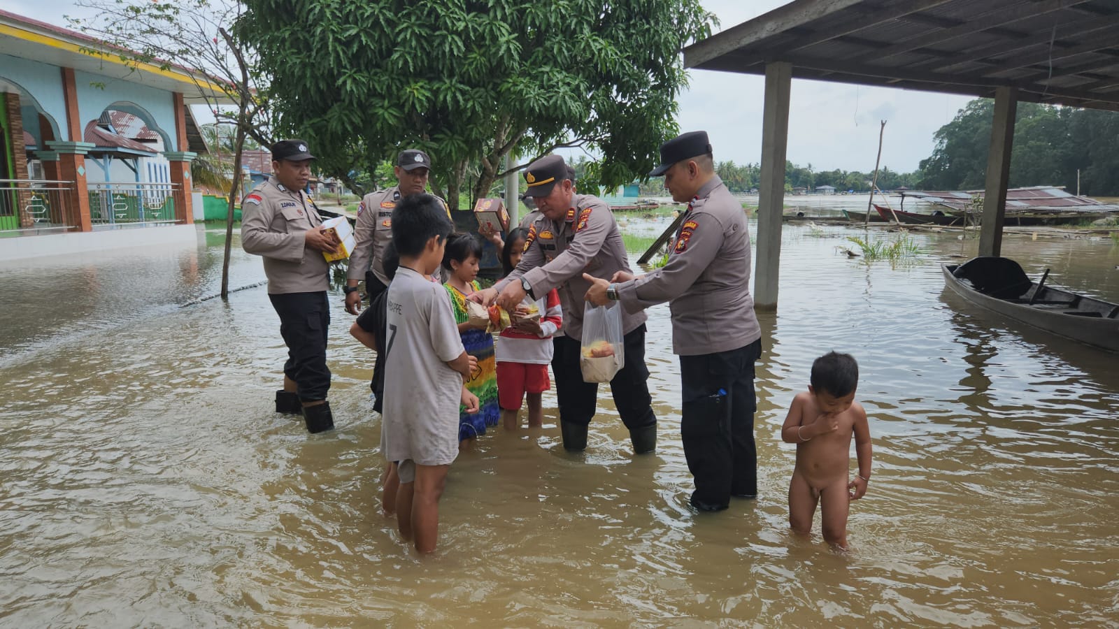 Hibur Anak-anak Terdampak Banjir, Kapolsek Kampar Kiri Hilir Berikan Bantuan.